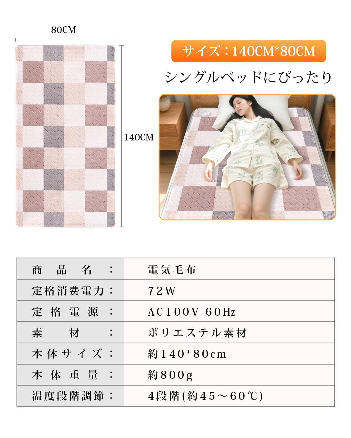 この電気毛布は、4段階の温度設定が可能で、寒い日でもあなたに最適な温かさを提供します。140×80cmのサイズは、ベッドやソファにぴったりフィットし、どんなシーンでも快適さをサポートします。