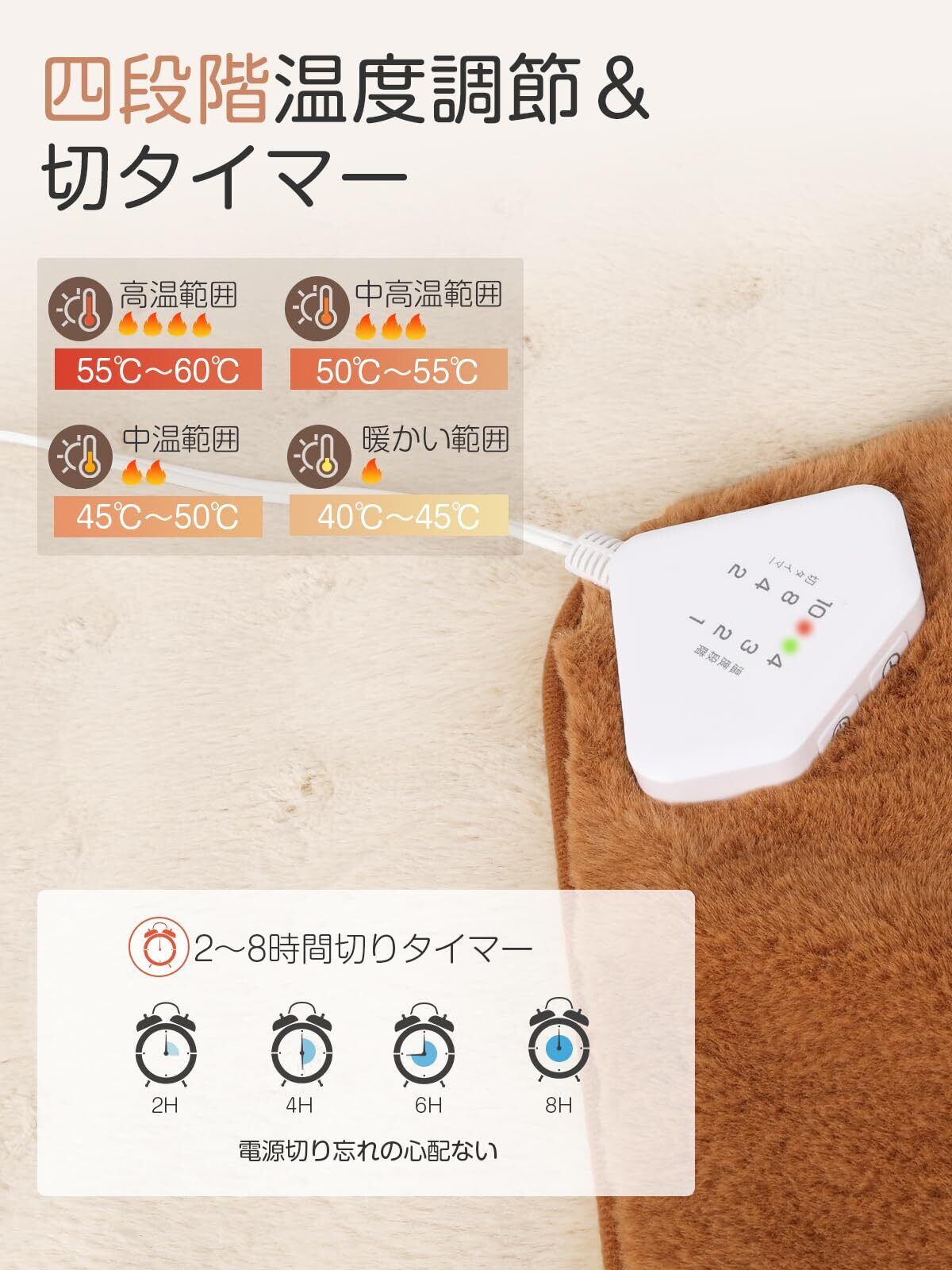 【4段階温度調整・切り忘れ防止タイマー付き】ホットマットはコントローラー付き、ボタンを押すだけの簡単操作で、4段階の温度調節(約40℃~60℃)が可能で、体の部位によって、最適な温度で使用できます。また、2時間、4時間、6時間、8時間に設定可能なオフタイマーを備えており、お必要により、運転時間を設定できます。タイマーが設定しない場合、2時間後自動に電源が切れ、付けっぱなしを防止できます。低温やけどや消し忘れによる事故を防ぎ、省エネにも貢献し、切り忘れの心配も軽減できるため、高齢者の方も安心して使用できます。