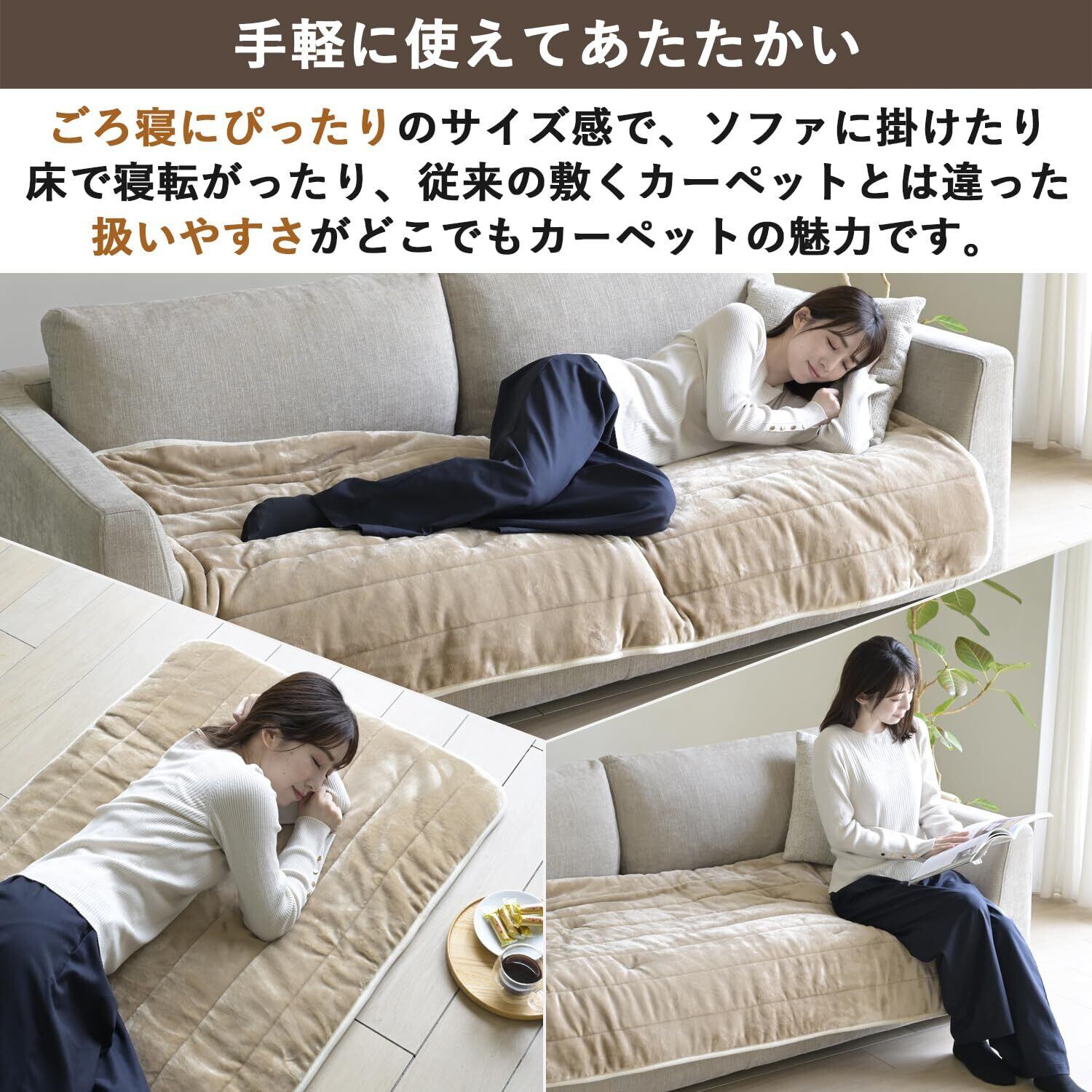 【ごろ寝にぴったり】ソファに掛けたり、床で寝転がったり、従来の敷くカーペットとは違った扱いやすさが魅力のどこでもカーペット。ごろ寝にぴったりのサイズ感で、裏面にはすべり止め加工が施されているので、床に敷いても滑りにくくなっています。