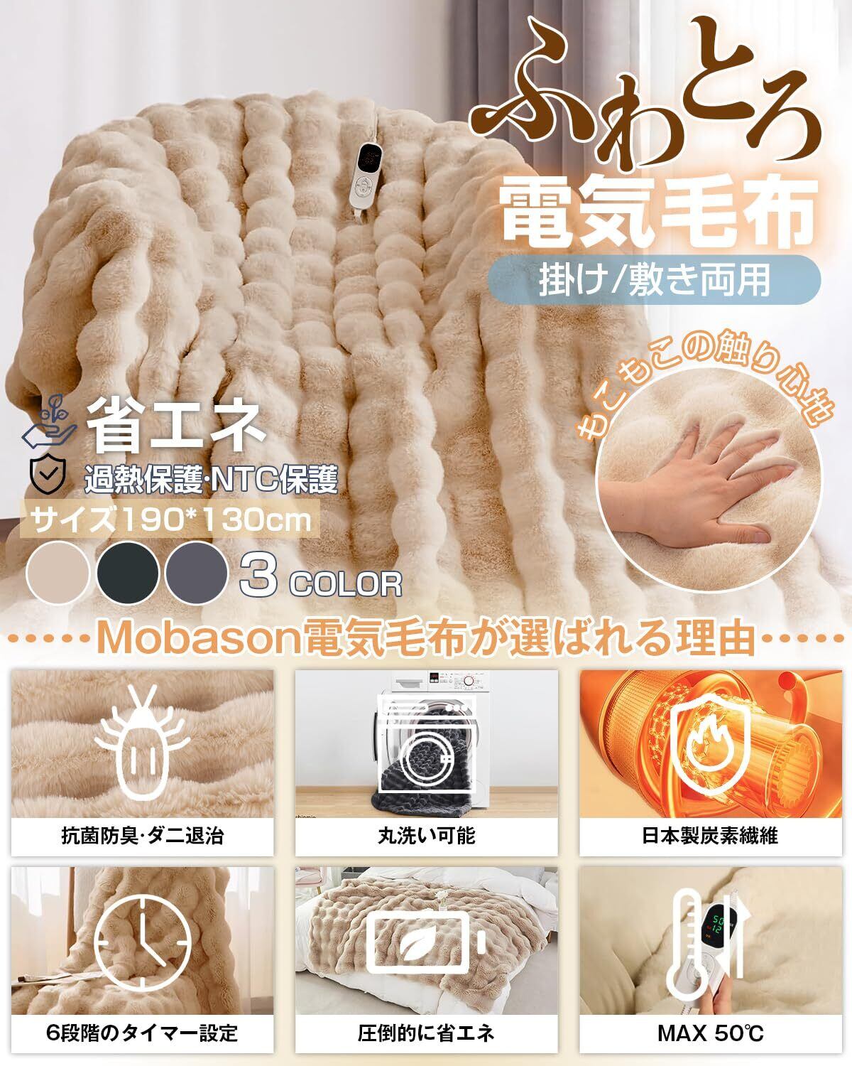この電気毛布は190×130cmの大きさで、掛け敷き両方に使える便利なデザインです。表面はふわふわのラビットファー調、裏面は柔らかな素材を使用しており、肌触り抜群の暖かさを感じることができます。大きなサイズなので、家族みんなでシェアして使えます!