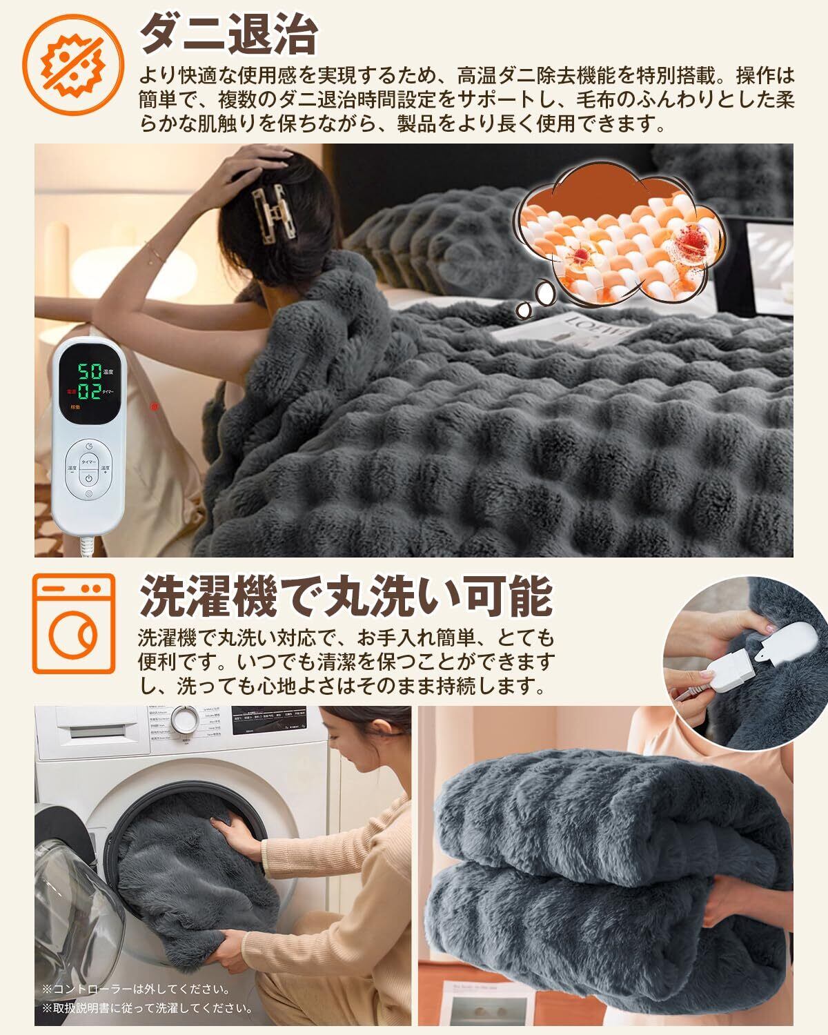 【ダニ退治機能付き・丸洗いOK】電気毛布をビニール袋に入れ、ダニ退治ボタンを押して2 ~ 3時間通電し、ダニを退治した。ダニを掃除したら、掃除機の吸引力を弱めにしてダニを吸い取ればスッキリ。丸洗いOK!汚れても電気毛布本体のプラグから電源コードを外し、洗濯袋に入れて洗濯機で完全に洗い、その後、風通しの良い日陰で乾かして自然乾燥させてください。いつでも清潔な状態で使用できます。商品到着後、初期不良があった場合は「注文履歴」から該当する注文の「注文に関する問題」→「出品者に問い合わせる」よりご連絡いただければ24時間以内に対応させていただきます。