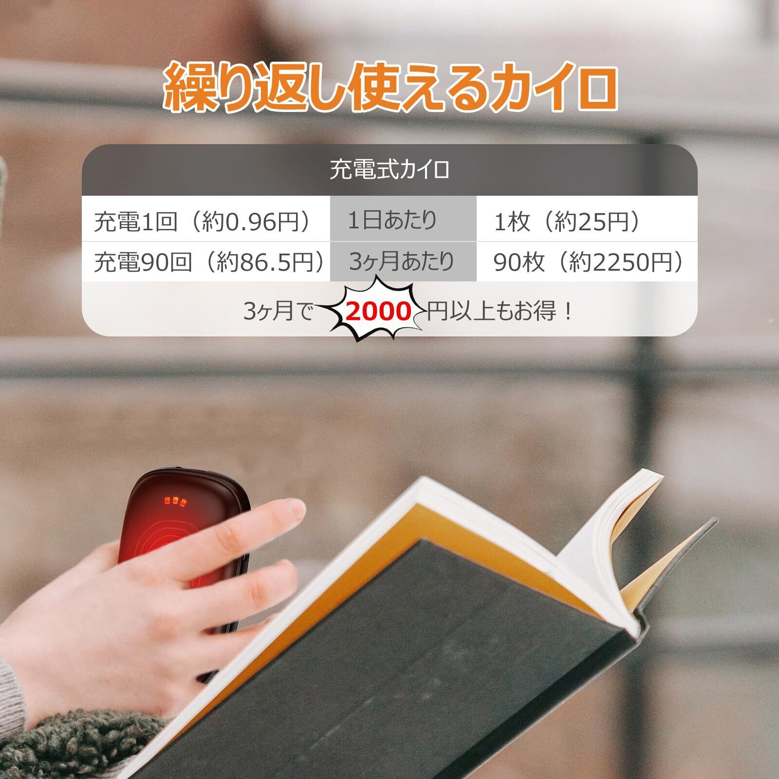充電式なので、繰り返し利用が可能!環境に優しく、電気代も抑えられます。冬の寒さ対策として使うことで、使い捨てカイロに比べて経済的でもあります。500回以上使用できる耐久性を誇ります。