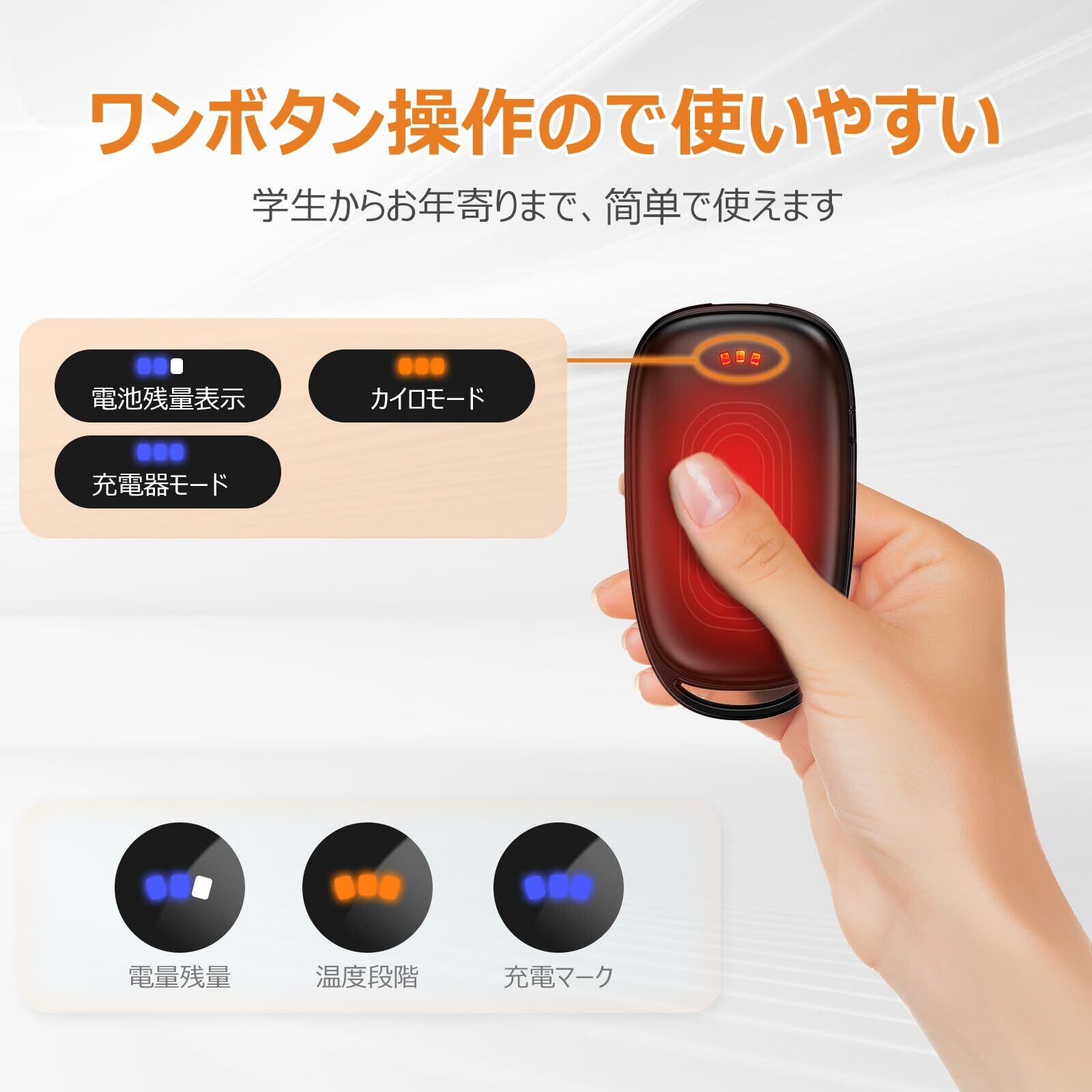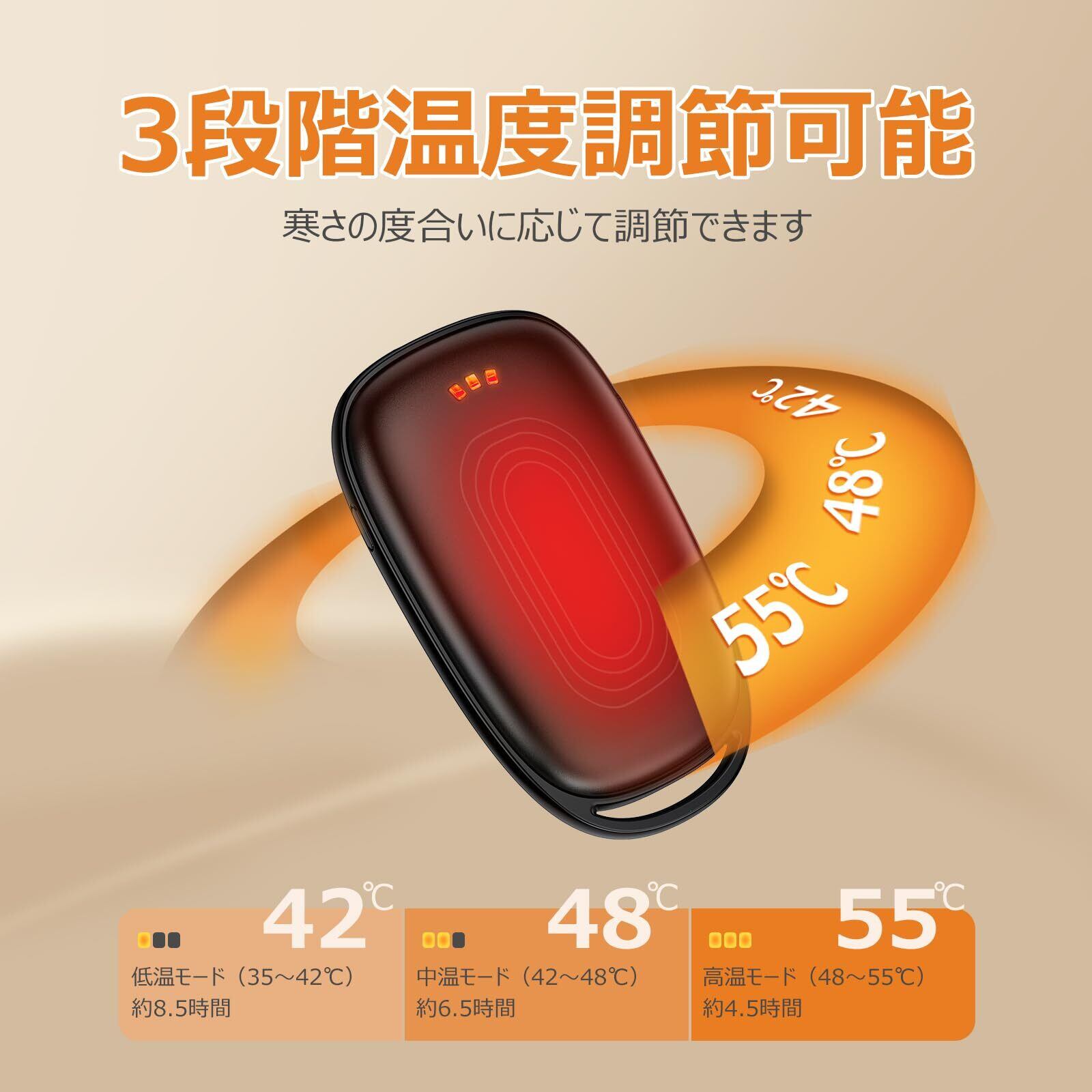 【酷寒対策2秒で両面急速発熱・3段階温度調節】最先端の熱伝導チップを搭載しており、発熱が速いだけでなく、性能も抜群で、わずか2秒で両面を急速に発熱させることができます。室内でも寒い屋外でも、指先からたっぷりと温度が伝わってくる安心感が感じられます。また、3段階温度モード調節機能が付き、初寒モード:35-42℃、寒中モード:42-48℃、極寒モード:48-55℃も搭載されており、自分の好みに合わせて使用することができます。