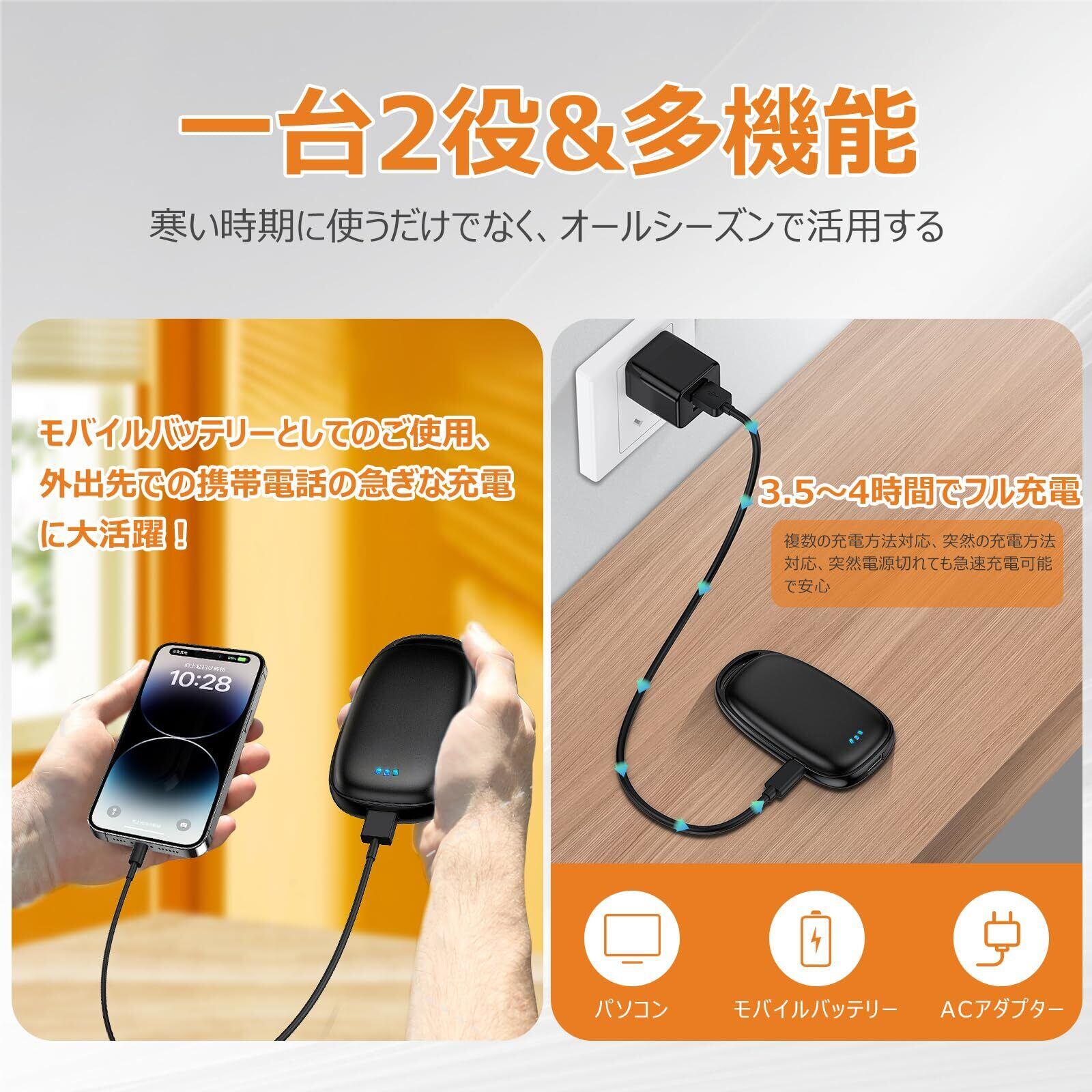【大容量バッテリー時間連続発熱可能・モバイルバッテリー機能として】6000mAh大容量バッテリーを内蔵し、4時間ぐらいの充電で8.5時間の連続発熱ができ、初寒モード:4.5時間の連続使用ができ、寒中モード:6.5時間の使用ができ、極寒モード:8.5時間の連続使用ができ、実際の使用時間は環境と使用状況によって異なる。大容量バッテリーが搭載され、ハンドウォマーとしてだけでなく、モバイルバッテリーとしても使えて、外出時に別のモバイルバッテリーを持ち運ぶ必要がないため、荷物を少なくしたい人にもおすすめです。