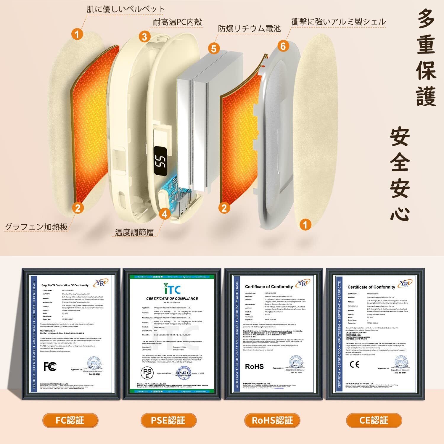 【PSE認証済・安心できる商品】日本の電気用品安全法(PSE)の技術基準に適合した安全性の高い商品ので安心・安全に使用いただけます。CE、FCとROHS認証も済みです。また、充電式カイロの内部に知能チップを搭載し、過充電保護、過放電保護、過電圧保護、過熱防止、漏電保護など各種保護機能を備え、安全性が向上させています。