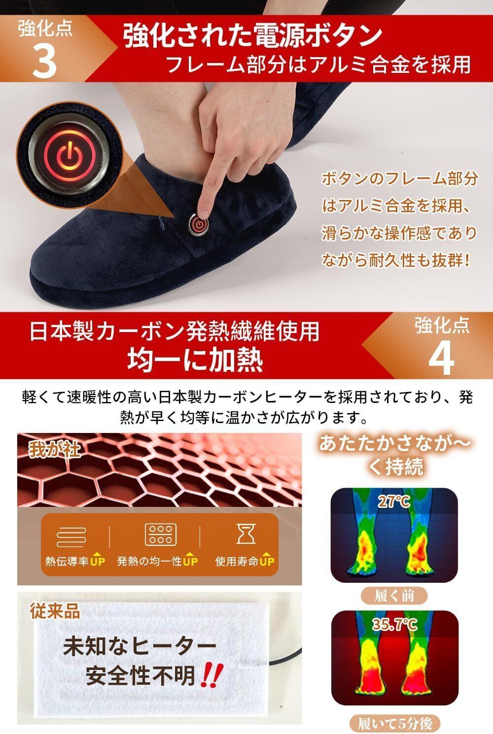 【両面発熱&1分間で速暖&寒い日も足ぽかぽかで快適に】他社のスリッパタイプの足温器は足裏にヒーターが内蔵されているため足の甲は温まりません。zzce足温器は暖かさを感じやすい足裏と足の甲に2つのカーボンヒーターが内蔵されているので、効果的に足冷え対策ができます。更に、安全性の高い日本製炭素繊維材質加熱シートを採用、繊維のようなしなやかさと強靭さを持ち、伝導熱率が高い、スイッチオンから5秒ほどで速やかに発熱し、最大65℃までじんわりと暖かくなります。足先から足元まで温まるので全身ぽかぽかします!冷え性の方に是非お試し頂きたいです。