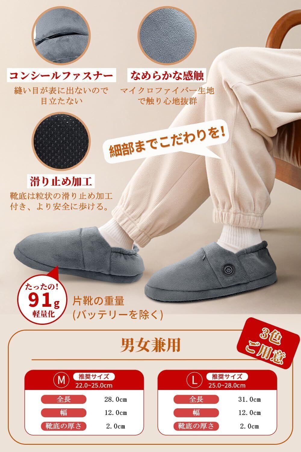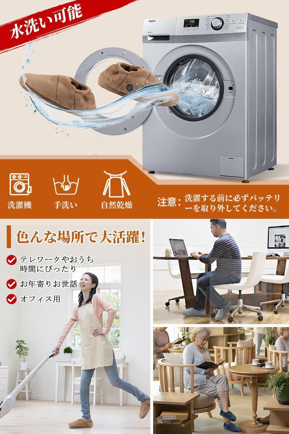 この電気スリッパはコードレス設計で、どこでも使用可能。お部屋の中を自由に動き回ることができ、そのままリビングやキッチンへも簡単に移動できます。家の中での行動範囲を広げます。