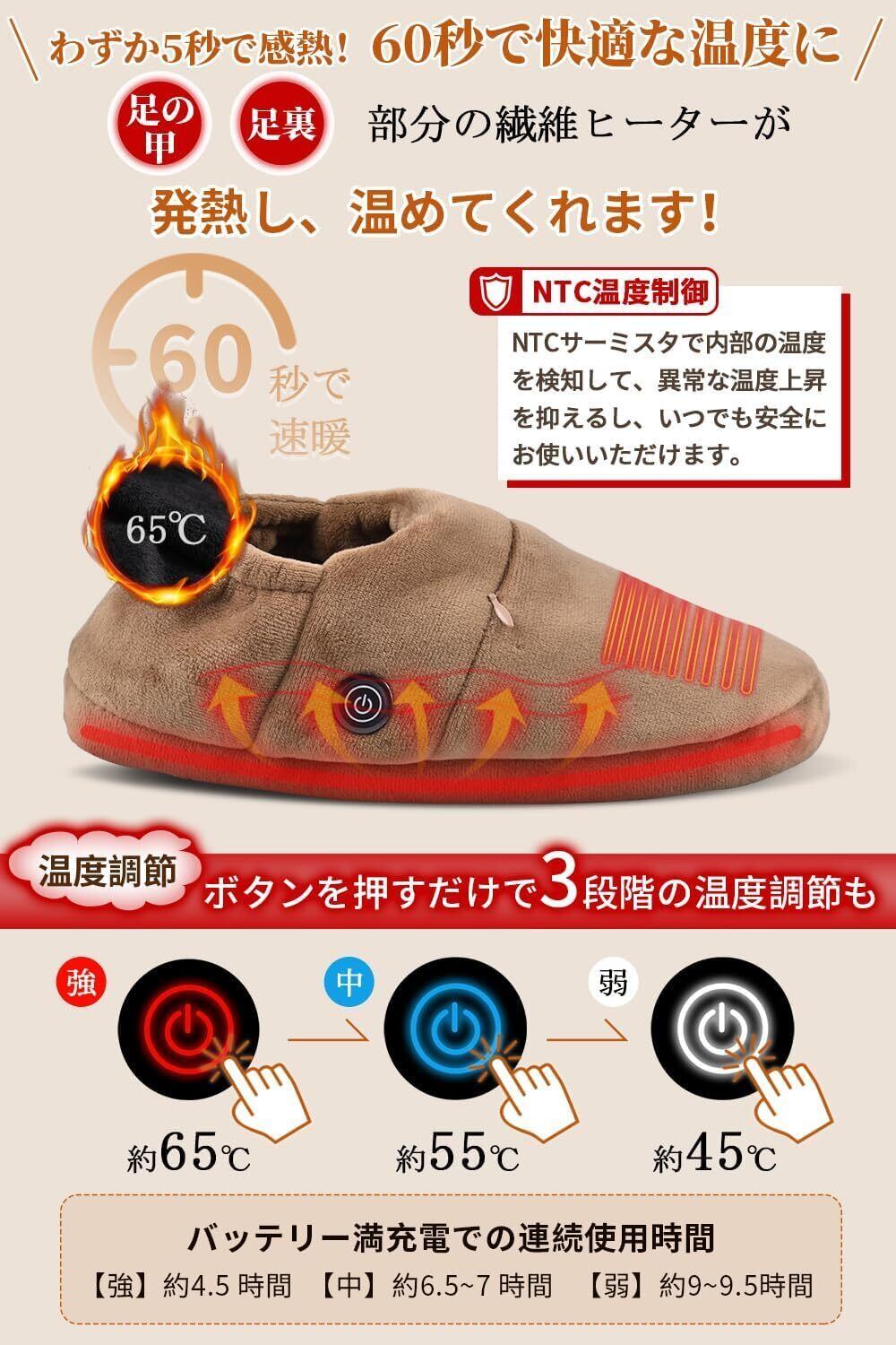 【3段階温度調節可能&ボタンひとつで簡単操作&NTC温度制御】電気スリッパは45〜65℃まで、細かく3段階の調節が可能です。低温から高温まで幅広い温度の調節ができるのでお好みや周囲の環境に応じて自由に選択できます。操作方法はボタンがひとつなので、迷うことなく誰でも簡単に操作できます。また、安全性を重視した設計で、過熱を防ぐ保護機能が備わっています。安心してご利用いただけます。※ヒーターの温度が75℃に達すると自動で電源がオンになり、やけどの心配もありません。