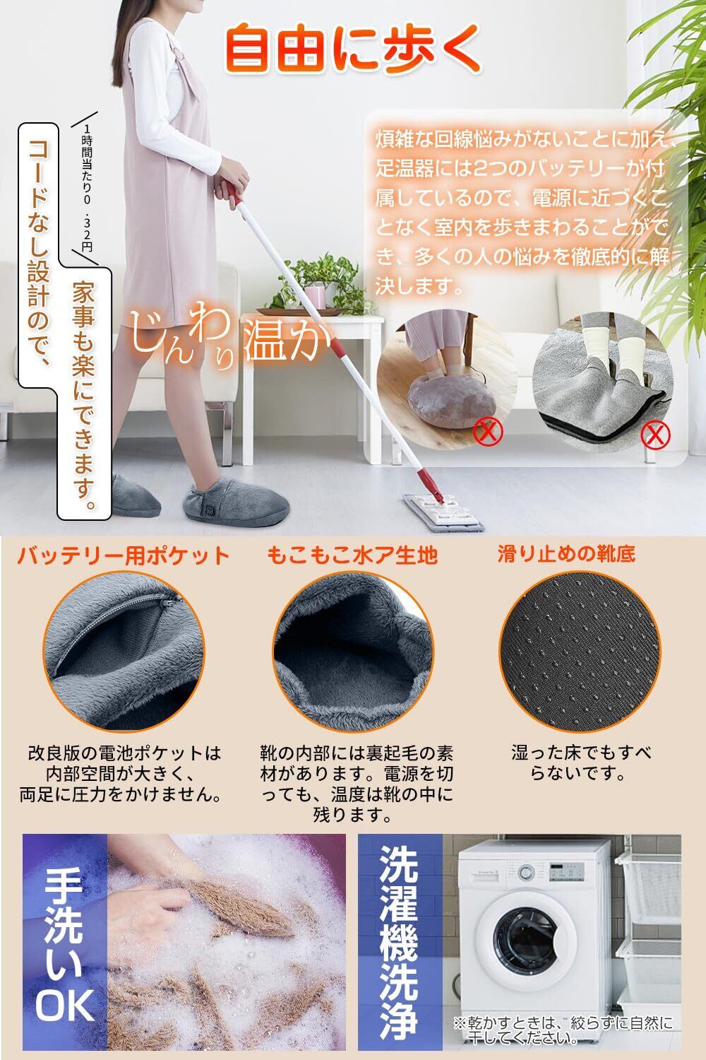 【省エネ&丸ごと洗う可能】冬にぴったりの暖房器具です!また、経済型の電気スリッパは、1時間当たり0.32円の電気代しかかかりません。冬の暖房の場合は、非常に多くの費用が節約できます。万が一電気スリッパに汚れがついても洗濯できます。電池を取り出し、DCポートをフタで覆うだけで、電気スリッパ本体は洗濯机で安心して使用でき、手洗いも可能。