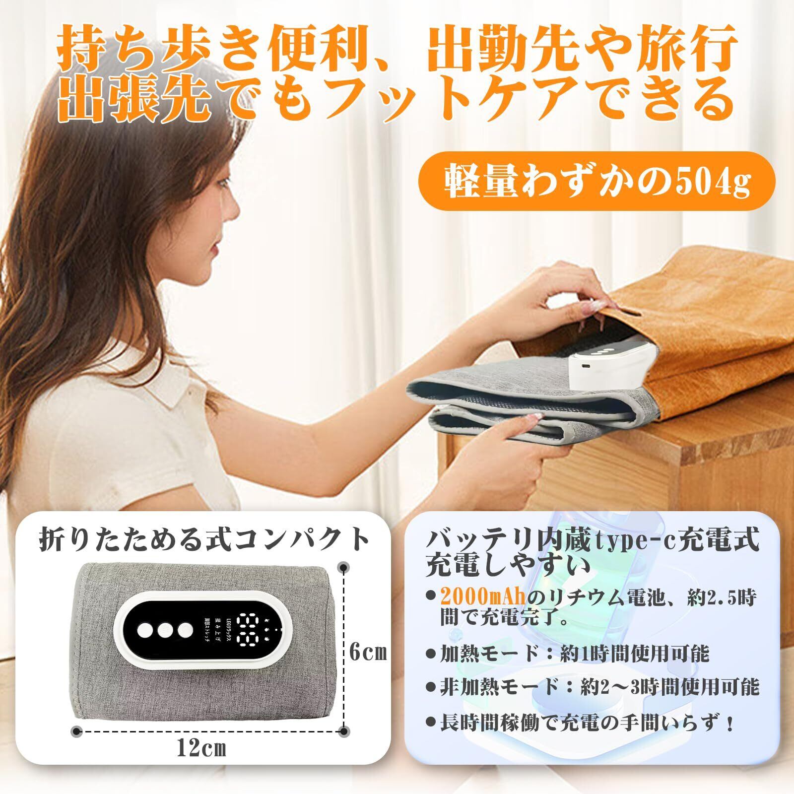 【充電式・コードレスデザイン】最大2時間連続作動可能の2000mAhの大容量長持ちバッテリーが内蔵。コードレス ふくらはぎの為、コンセントの近くにいる必要がなく場所を選ばずに使える。仕事中やテレビを見ながらでもどこでもリラックスできます。立ち仕事や座り仕事、横になっている時も場所を移動しても外さなくてもどんな姿勢でも使いやすいデザイン。装着したまま家事やトイレも可能なので実にコードレスがストレスフリーです。