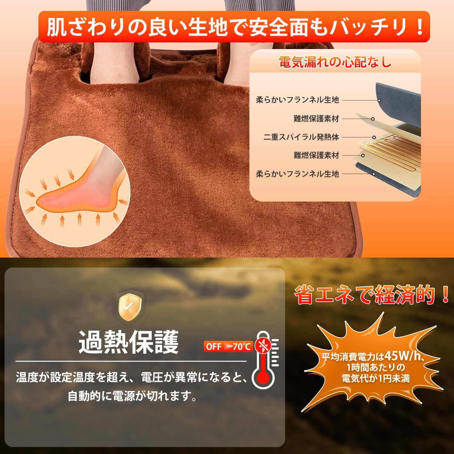 【過熱保護・省エネ・PSE認証済】フットウォーマーはPSE認証済み、リアルタイム監視、絶縁保護、難燃性保護、回線保護、過熱保護の五重発熱保護層があります。過熱・電圧異常が発生した場合、電源が自動的に切れ、過度の加熱による火傷も防ぎます。足温器は消費電力が少なく、省エネ性に優れています。平均消費電力は45W/hで、1時間あたりの電気代は1円前後です。