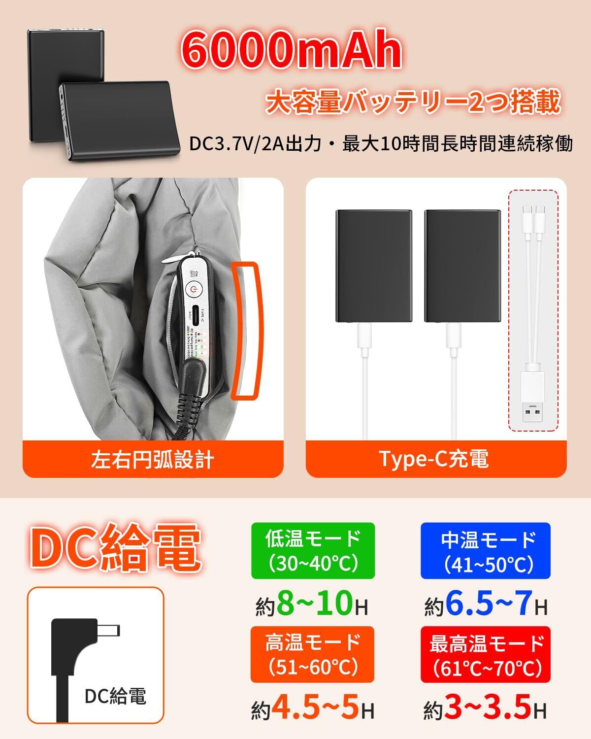 【USB充電式スリッパ&10秒速暖&長時間連続作動可能】6000mAhのバッテリーが2個付いているので、いつでもどこでもUSB充電ケーブルに接続できて便利です。足裏には日本製の炭素繊維を用いた加熱素材を採用し、安定した暖かさと、素早く均一な加熱を実現しています。つま先から足の甲まで温めます。 電源に接続すると、10秒で暖かくなり、最高70℃に達する。加熱保護も付いているので、絶縁も安全性があり、安心して使用することができます。また、足首に合わせて調節できるドローコード付きで快適に履くことができます。6000mAhの大容量バッテリーが2つ搭載されており、超高温モードで3~3.5h、高温モードで4.5~5h、中温モードで6.5~7h、低温モードで8~10h連続使用可能です。