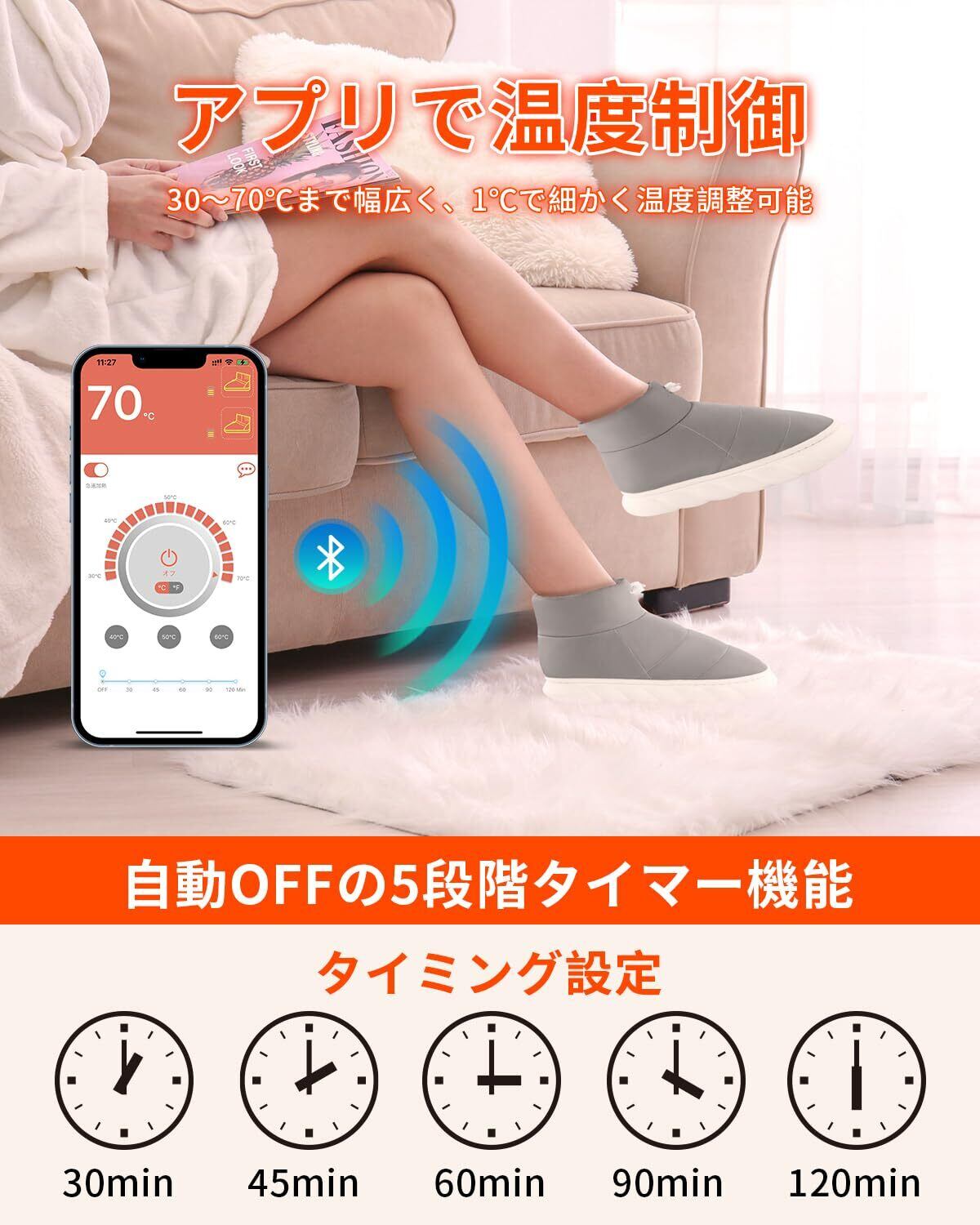 電気スリッパ 足温器【6000mAhバッテリー付&10秒で温度感知&アプリで温度制御】35~70℃無段階温度調節 日本製ヒーター内蔵 あったか足温器 左右分離式 歩き回れる 電気フットウォーマー 柔らかい 滑り止め 軽量 防寒グッズ 暖房器具 自宅/オフィス/旅必需品 洗濯可能 男女兼用 日本語取扱説明書付き (L)