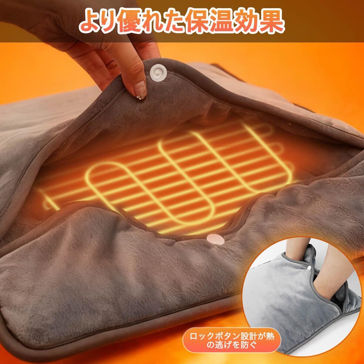 【やさしい肌触り&強力な保温性】この足元ヒーターは厚手の高品質クリスタルベルベット生地を採用。なめらかで柔らかく、心地よい肌触りで、毛抜けや色落ちもしにくい仕様です。ホットマットは全体にポケット型デザインとロック式構造を採用し、暖かい空気をしっかり閉じ込めて熱を保持します。一般的な素材をはるかに上回る保温効果を発揮します。フットウォーマー 足入れタイプは、オフィスでも自宅でも快適に使える暖房アイテムです