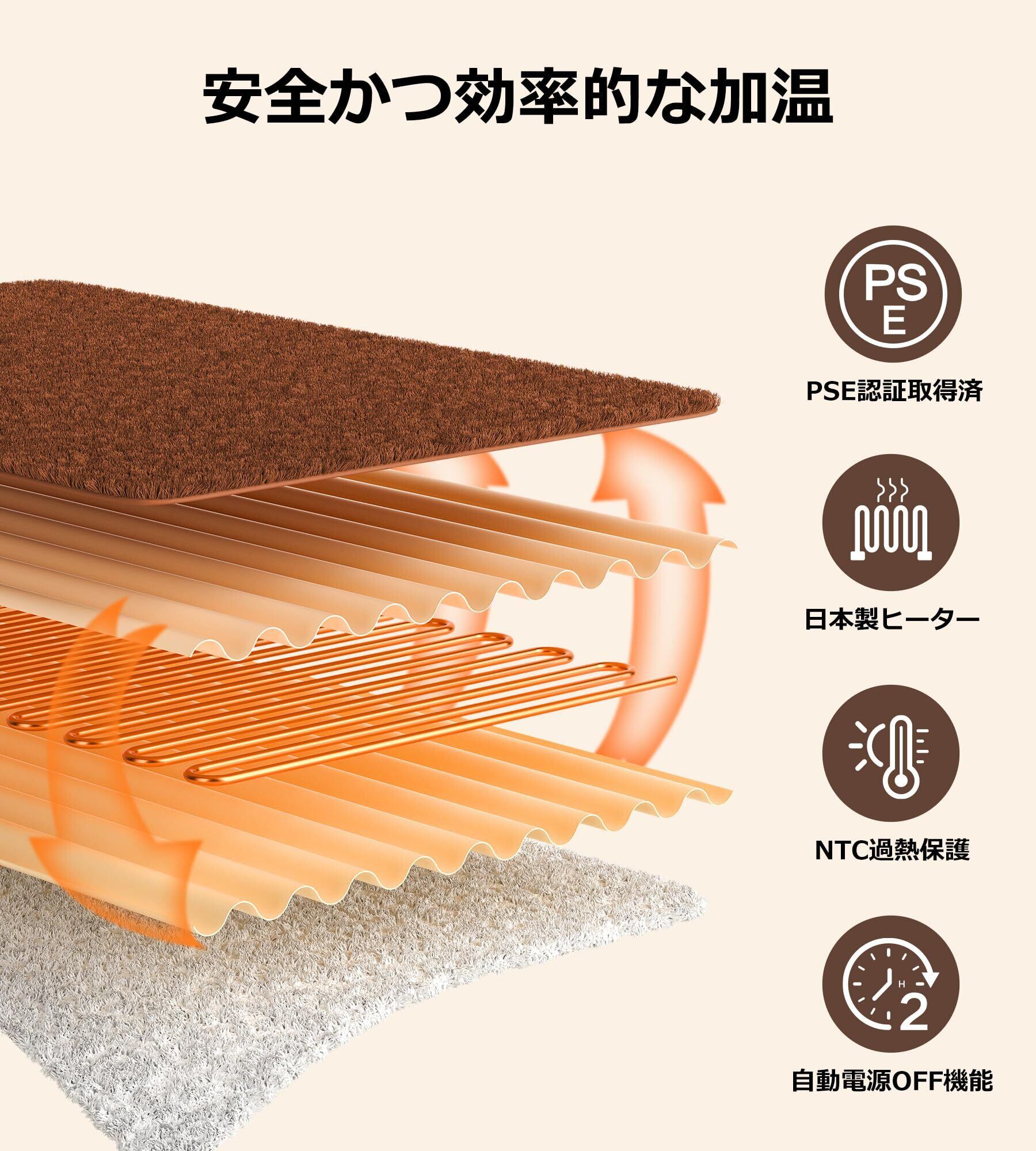 【操作簡単&機能が充実】お好みに合わせて7段階の温度(35℃→38℃→42℃→45℃→48℃→52℃→55℃)を調節できます。また、6段階(0.5H→1H→1.5H→2H→4H→6H)の切タイマー機能が搭載され、あたためすぎや切り忘れの心配はありません。