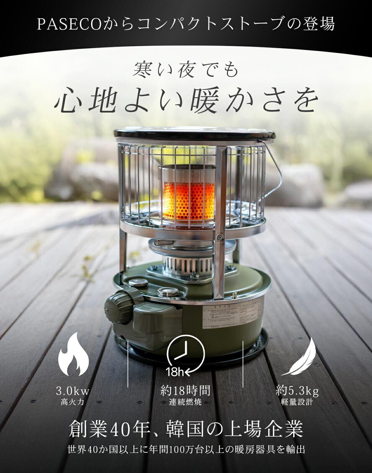 【⾒た⽬以上の、機能性を。】軽くて⼩さいので、キャンプなどへの持ち運びが便利なうえ、⾼出⼒3.0kWhの優れた暖房性能、寒い冬などでも⼤活躍。さらに、約18 時間の連続燃焼も可能で、⻑時間のアウトドアイベントなどにも重宝します。