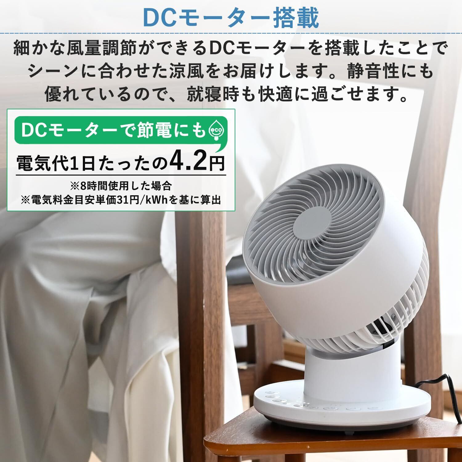 【静音】DCモーター制御による静音モードを搭載。静音モード運転時は寝ていても音が気にならない程静かなので、快眠のサポートに役立ちます。DCモーターは消費電力も少なくて済み、節電にもつながります。