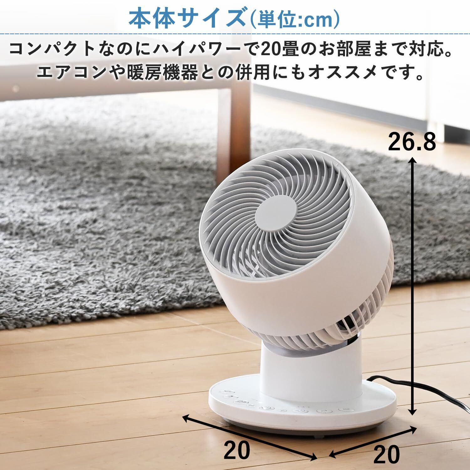 このサーキュレーターは、最大20畳まで対応しており、広い空間でもしっかりと空気を循環させます。エアコンや暖房の使用時には、効率を高め、快適さを実感できるアイテムです。