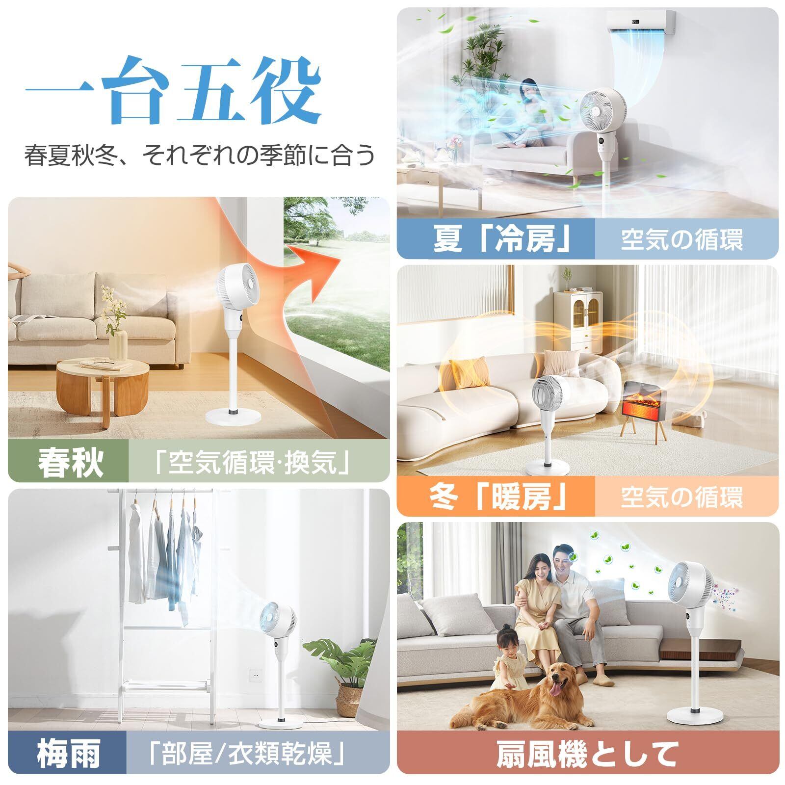 高度な機能を備えたこのサーキュレーターは、風量を6段階で調節可能。冷房や暖房の補助として、季節を問わず一年中お使いいただける便利なアイテムです。また、部屋干しや換気、梅雨の湿気対策、衣類乾燥にも役立ちます!
