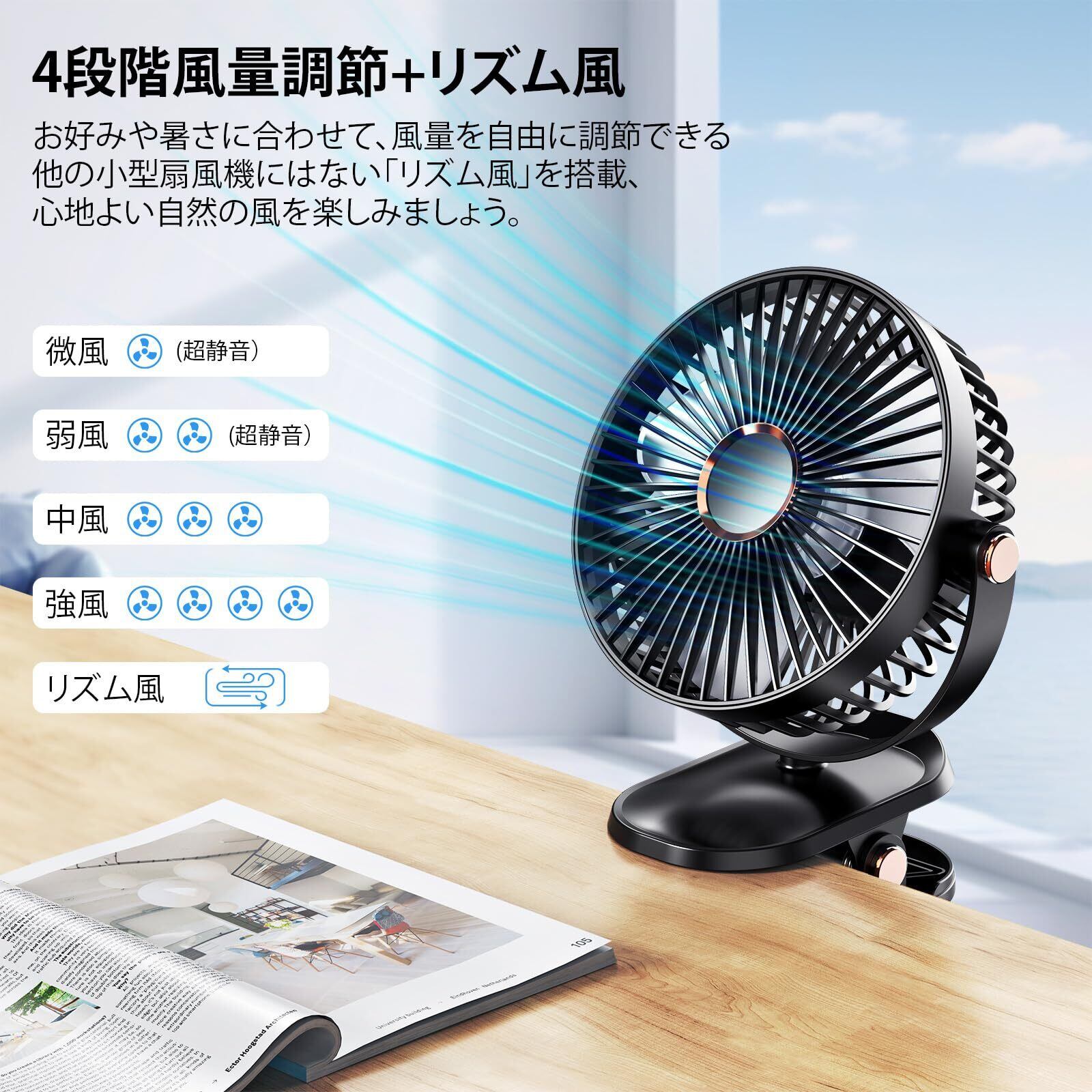 スタイル 「上下左右360°回転(手動)」「風量4段階」「卓上・クリップ2WAY」