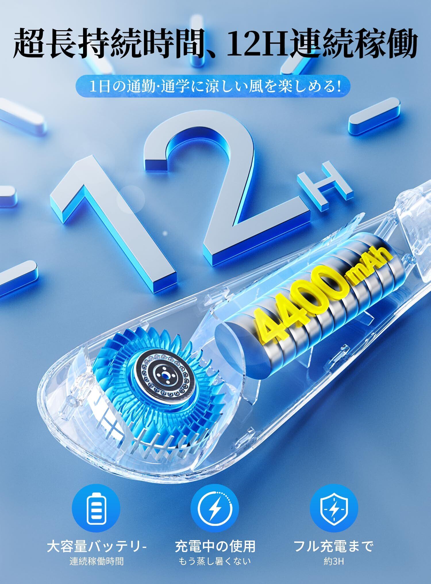 【長時間稼働・軽量設計】 PSE認証済みの4400mAh大容量バッテリーを搭載し、送風モードでは最大12時間の連続使用が可能。冷却モードでは、温度設定(15℃・20℃・25℃)に応じて3~5時間持続。TYPE-C充電式を採用し、約3時間でフル充電が完了。TYPE-C充電式に対応しており、わずか3時間でフル充電が完了します。さらに、軽量・コンパクト設計(重量わずか350g)で、バッグやポケットにすっきり収納可能。通勤や旅行、アウトドアでの使用にも最適です