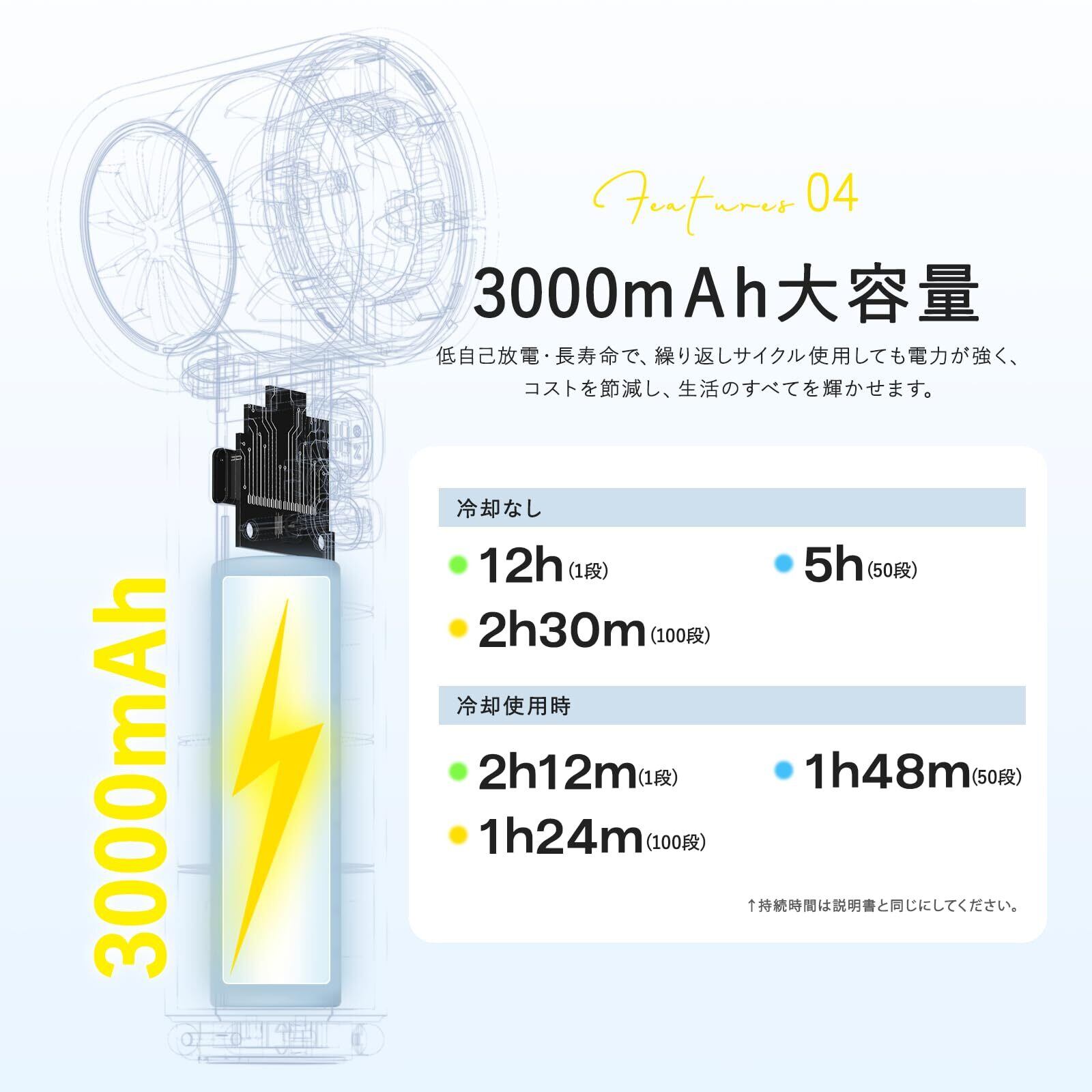 わずか約250gの軽量設計で、バッグやポケットにすっきり収納可能。手持ちタイプで携帯しやすく、いつでもどこでも涼しさを楽しむことができます。通勤や通学にも最適なサイズ感です。