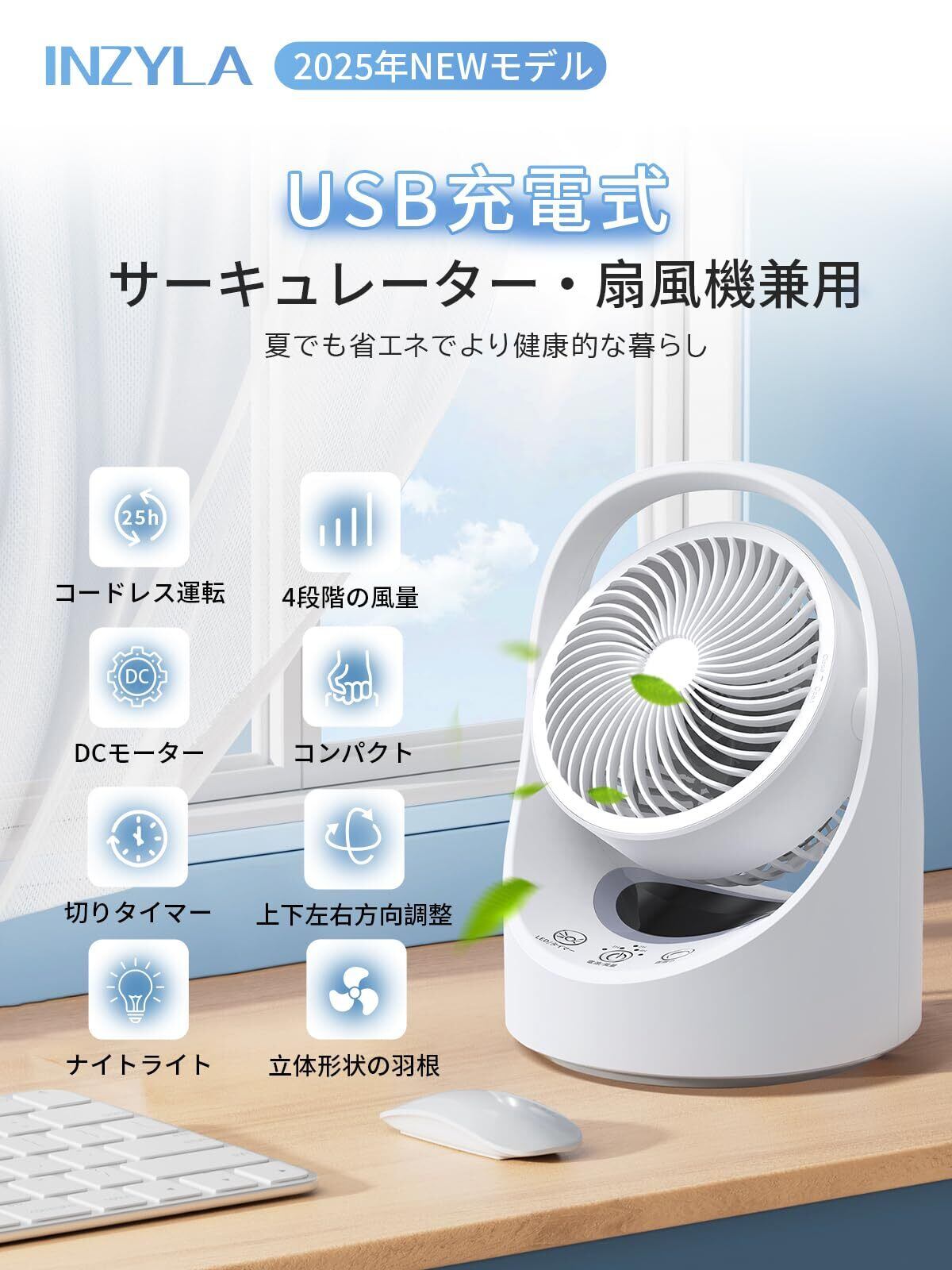 【一年中通用&節電最高な味方】INZYLA2025年最新型のサーキュレーターは四季を通じて便利に使えます。夏にはエアコンと併用すれば冷房効率が上がるし、冬には暖房と一緒に使うことで室内の温かい空気を循環させるし、春秋には部屋の換気を促進するし、梅雨の時期には湿気を取り除き、衣類を乾燥させることもできます。DC5V/2Aの電源で、1時間当たりの電気代は約0.27円です。エアコン&暖房にこのサーキュレーターを使用することで、空気を素早く部屋の隅々まで届けて室温バランスを整え、エアコン&暖房の消費電力を最大約37%削減できます。