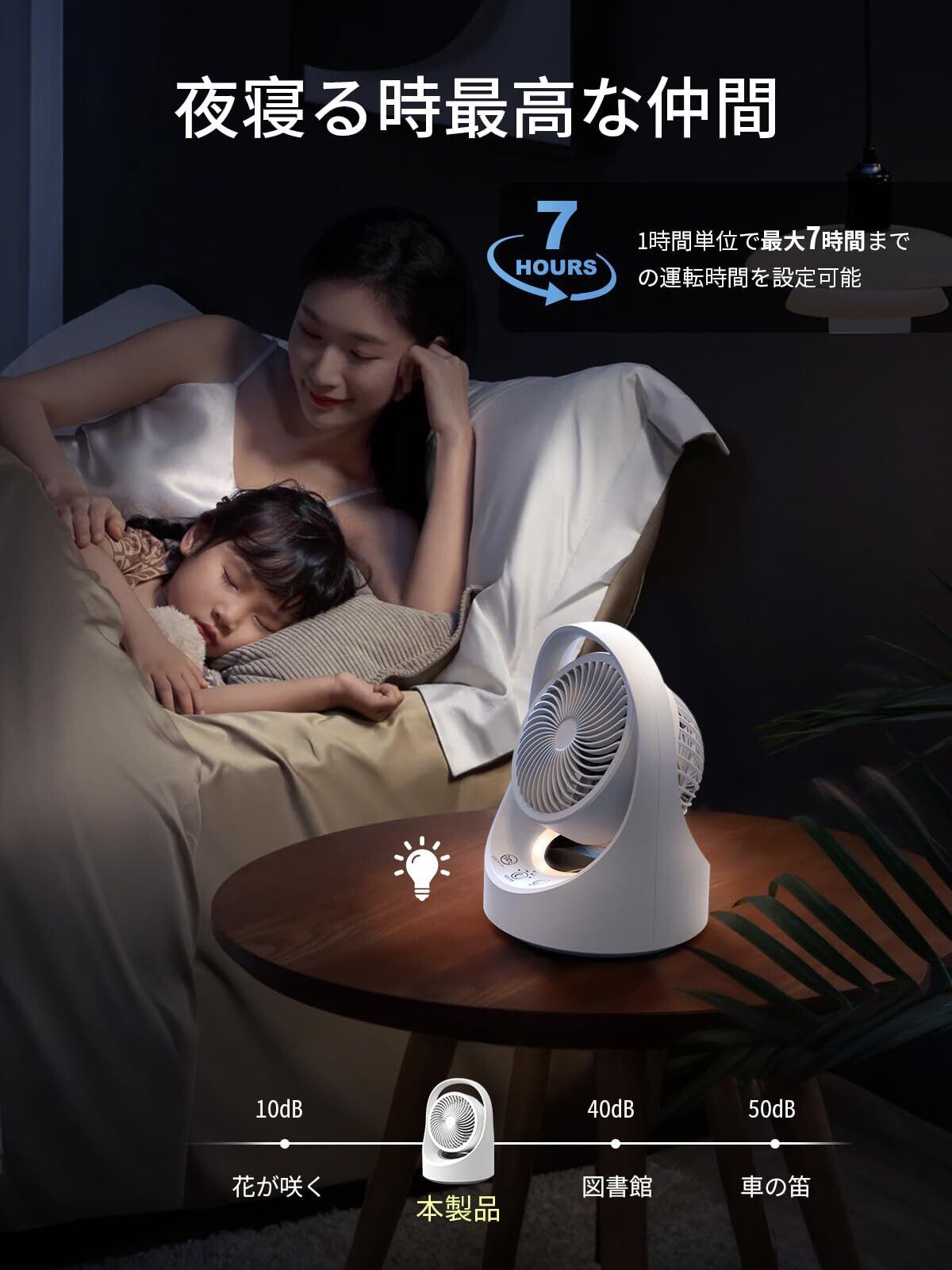 【静音運転&1-7Hタイマー機能&ナイトライトで快適な睡眠環境に】当社の扇風機は切りタイマー機能が付いており、設定した時間が経過すると自動的に電源を切ることができます。最大7時間までタイマー自動OFF設定が可能になります。お好みの設定で風量や運転時間を調節し、快適な睡眠環境を実現します。静音設計で、寝室や赤ちゃんのいるの部屋、会議室など、場所を選ばずご使用いただけます。ナイトライトの機能で、寝る前ベッドにスマホを使う時も目の損害を軽減します。