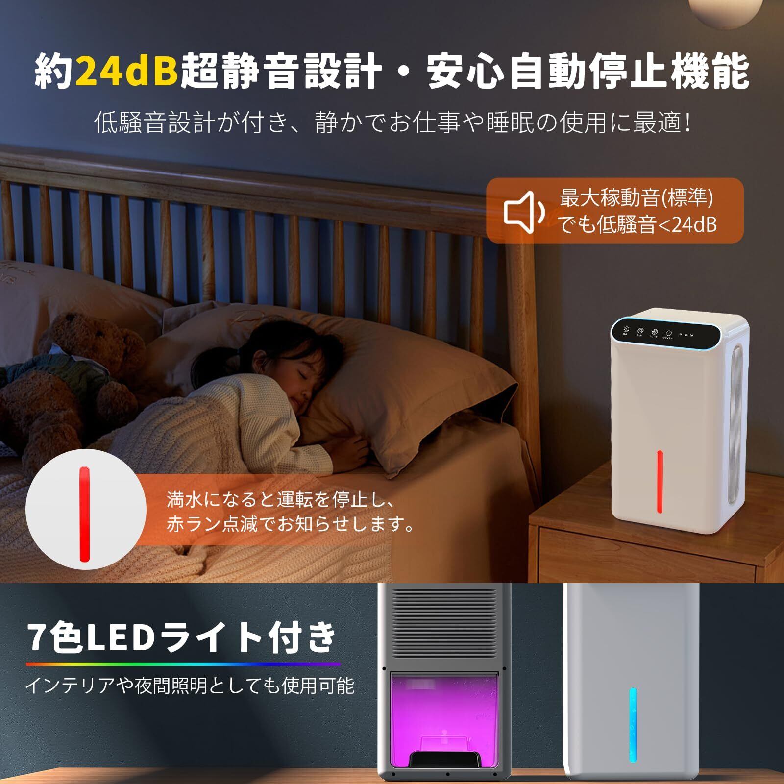 特徴 ①除湿機・空気清浄機一体型 ②强力除湿 ③大容量2.5L ④24時間タイマ ⑤休みモード付き ⑥満水自動停止 ⑦静音運転