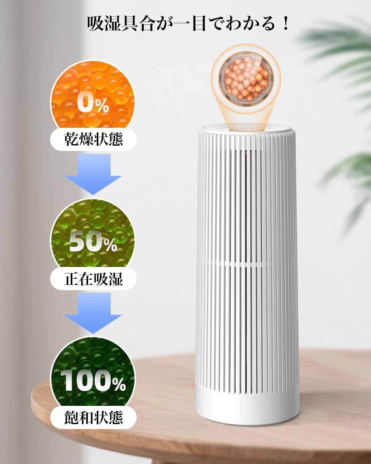 【見える除湿で安心】透明な窓から見える色の変化で、現在の除湿状況を確認できます:オレンジ色(乾燥中)→ 緑色(湿気吸収中)→ 深い緑色(完全に水分吸収済み)。