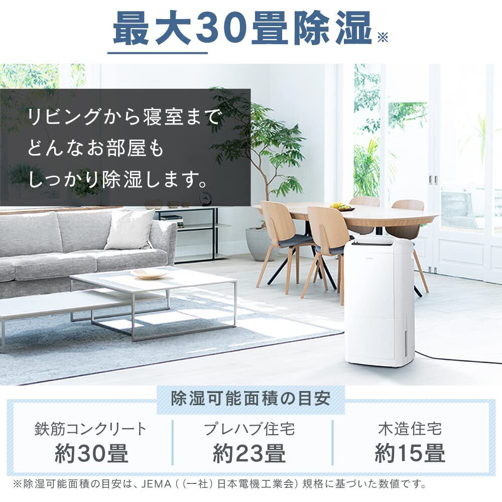 除湿可能面積の目安/木造:15畳(25m2)/プレハブ:23畳(38m2)/鉄筋コンクリート:30畳(50m2)※除湿可能面積の目安は、JEMA((一社)日本電機工業会)規格に基づいた数値です。
