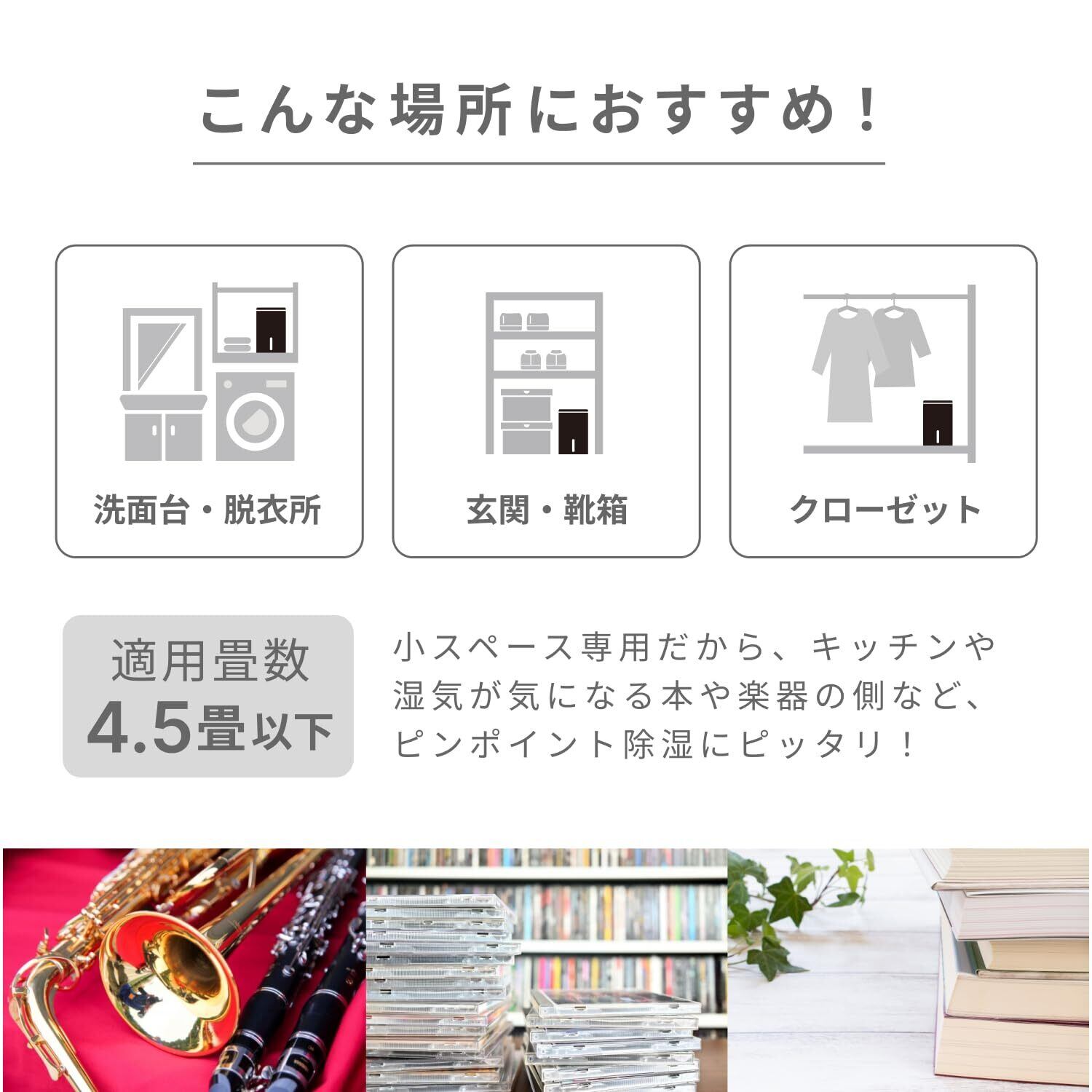 クローゼット、下駄箱、押入れ、寝室、洗面所、トイレなど、さまざまなシーンで活躍。特に一人暮らしの方にとって、コンパクトながら強力なこの除湿機は、湿気対策に欠かせないアイテムです。