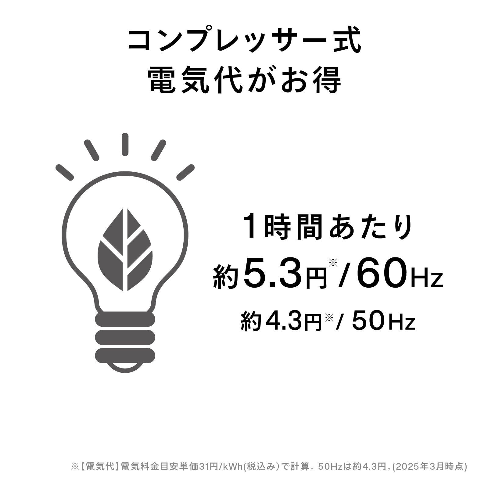 【1時間あたり約5.3円】 ヒーターを使用しないコンプレッサー式で消費電力が低いため、1時間あたり約5.3円で使用できます。