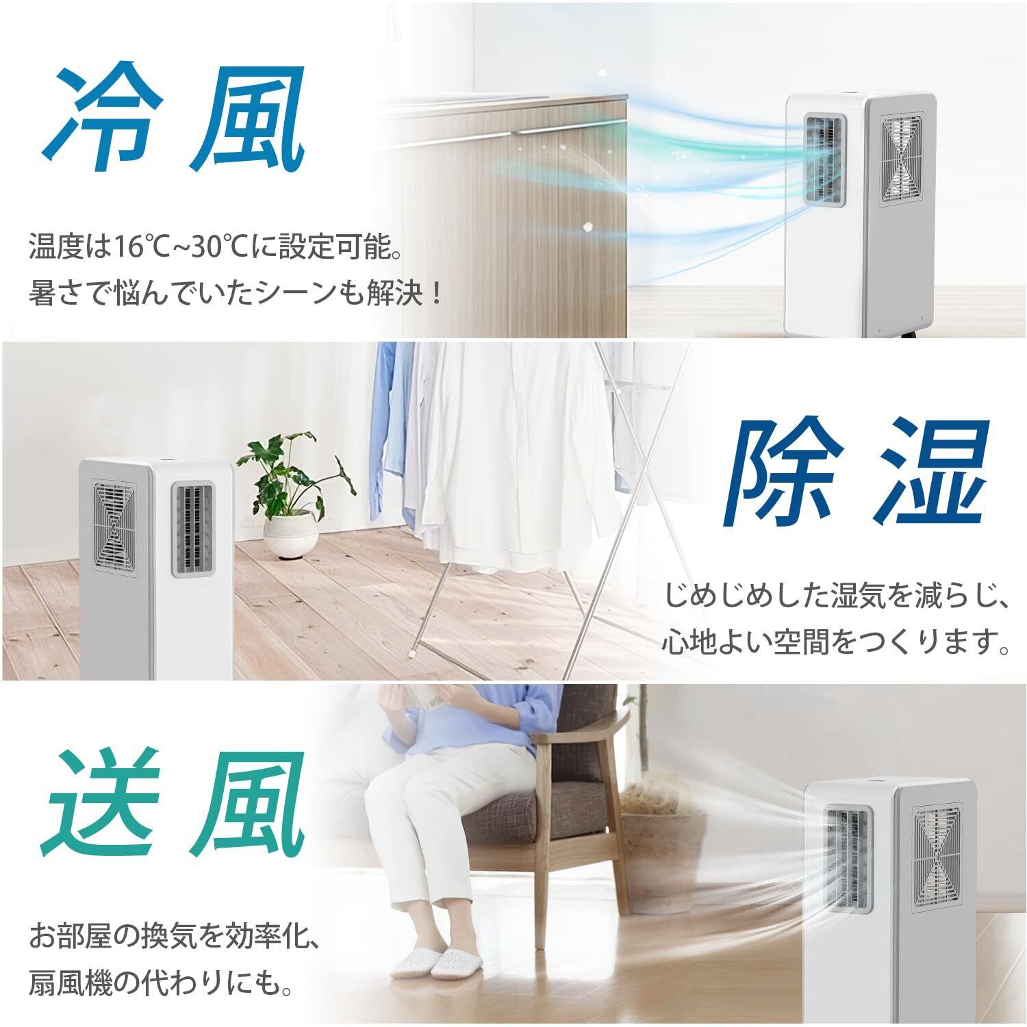 このポータブルクーラーは、冷風、送風、除湿の3つの機能を兼ね備えています。特に除湿機能では、1日あたり15Lの水分を取り除くため、部屋干しや梅雨時期のカビ防止にも最適です。家庭の様々なシーンで快適さを提供します。