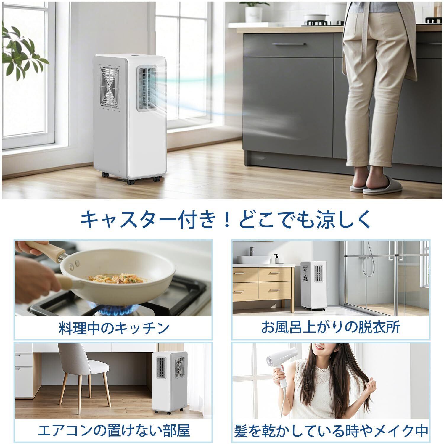 【工事不要!どこでもひんやり涼しいポータブルクーラー】設置工事不要!コンセントを差すだけで届いたその日から使えるスポットクーラー。キャスター付きでどこでも好きな場所へ移動できる。コンパクトサイズで置き場所を選ばないので、エアコンが設置できない部屋もかんたんに涼しく。新築物件や賃貸住宅など壁に穴を開けられずエアコンが設置できないお部屋、料理中のキッチンやお風呂上がりの脱衣所、熱気がこもりやすいガレージなどの作業場、などにもおすすめ。ご使用の前のご注意※本製品は冷房機ではありません。スポット冷風機のため部屋全体を冷房することはできません。