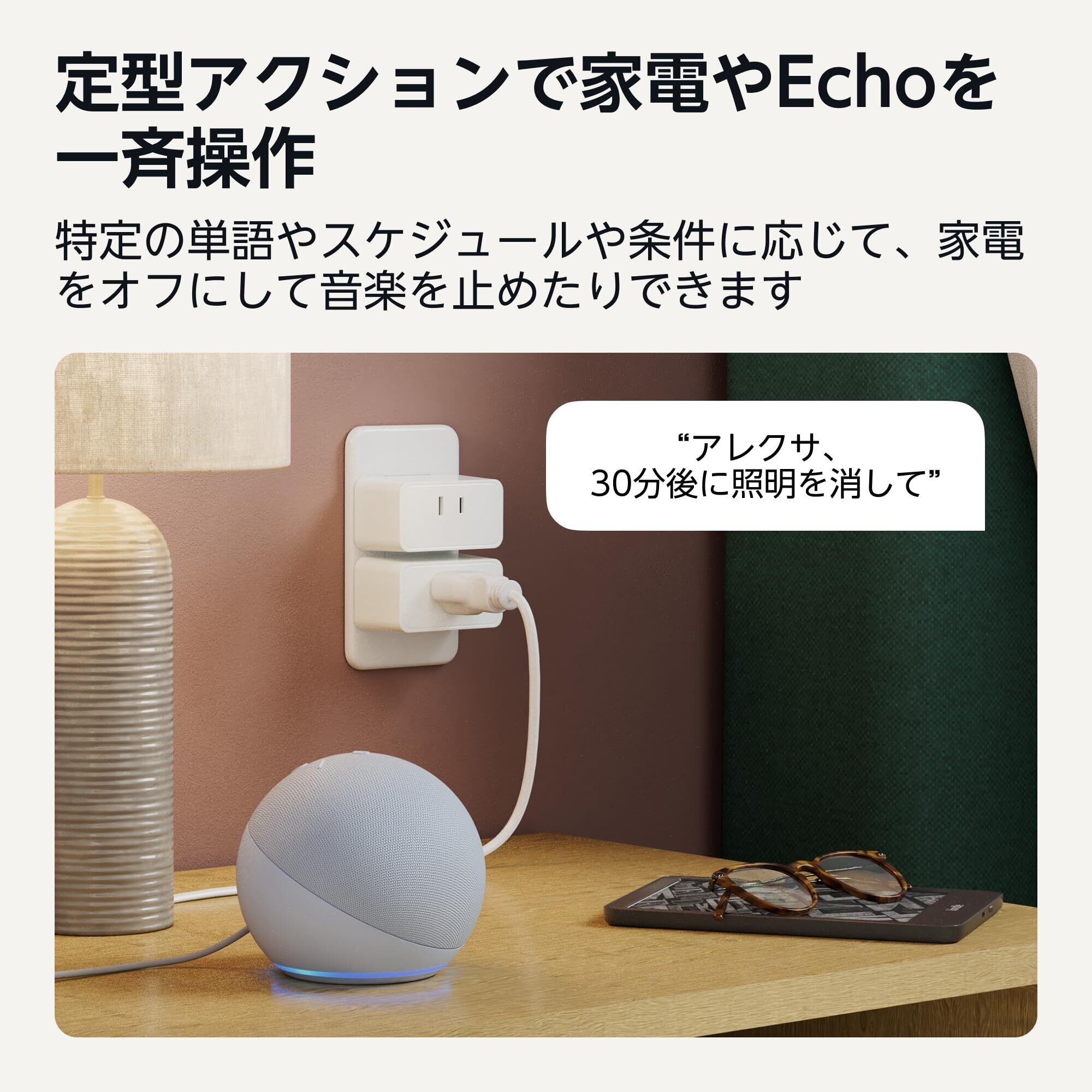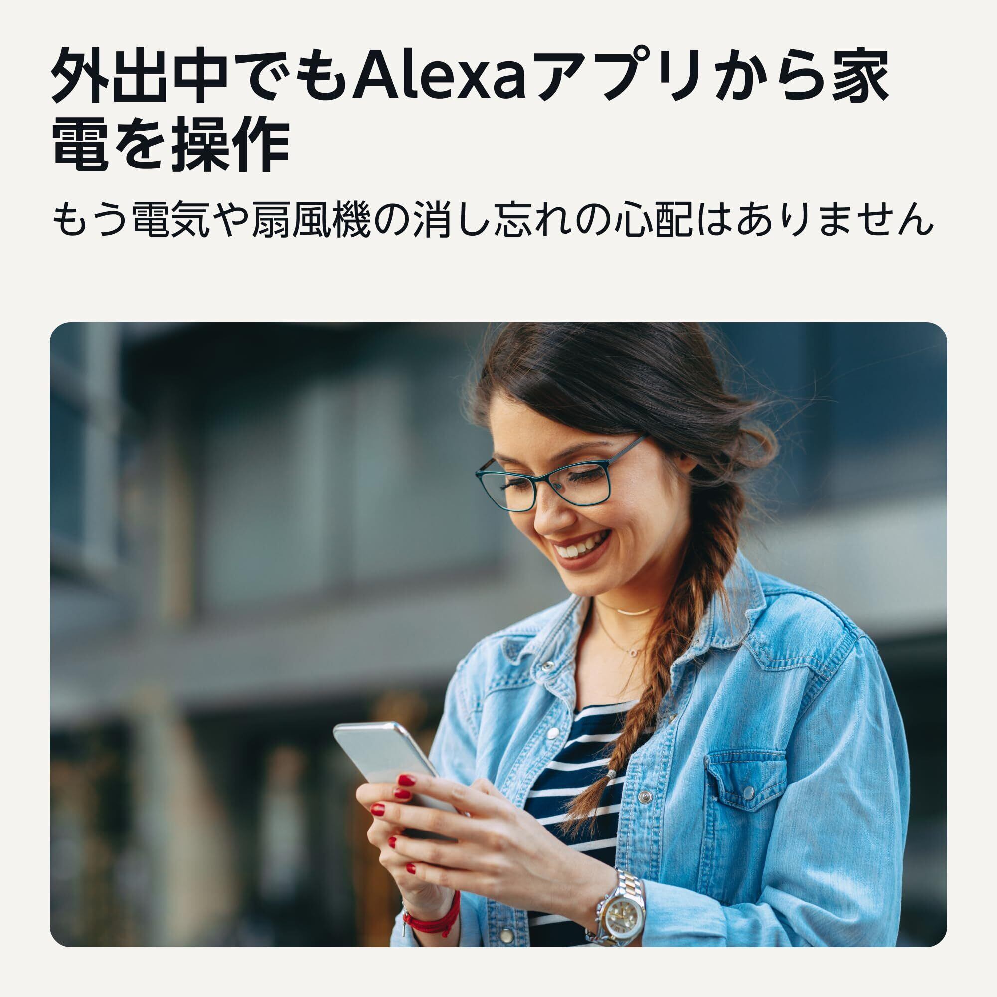 【定型アクションでオン/オフ】お持ちの照明や扇風機など、定型アクションをAlexaアプリで作成をすれば自動的に電源をオン/オフにすることができます。また、Alexaアプリを使えば、外出先からオン/オフの操作も可能です