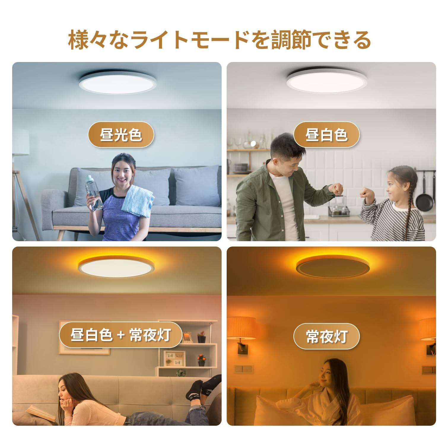 【10段階調光&7段階調色&5種類の色温度ワンタッチ変換】 電球色/昼白色/昼光色/常夜灯/常夜灯+昼白色+昼光色など、自由に変換できます。現在、新しくアップグレードされ、常夜灯と昼白色が同時に点灯するようになり、光がより明るく透き通るようになりました。リビングルーム/キッチン/寝室/書斎など、さまざまなシーンに適しています。