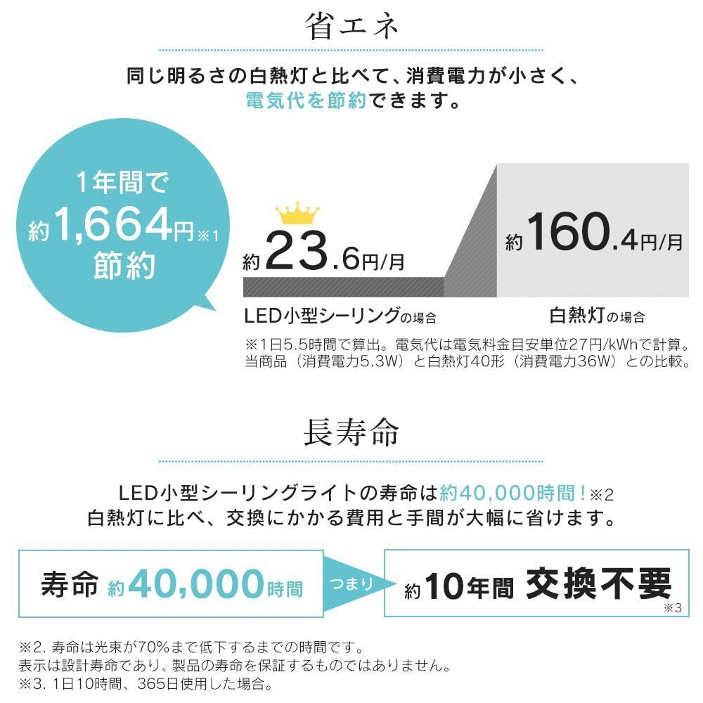 「節電対策・照明工業会加盟」の小型シーリングライト、600lmの明るさ、電球色で温かい光を提供。どんな空間にもマッチするデザインです。