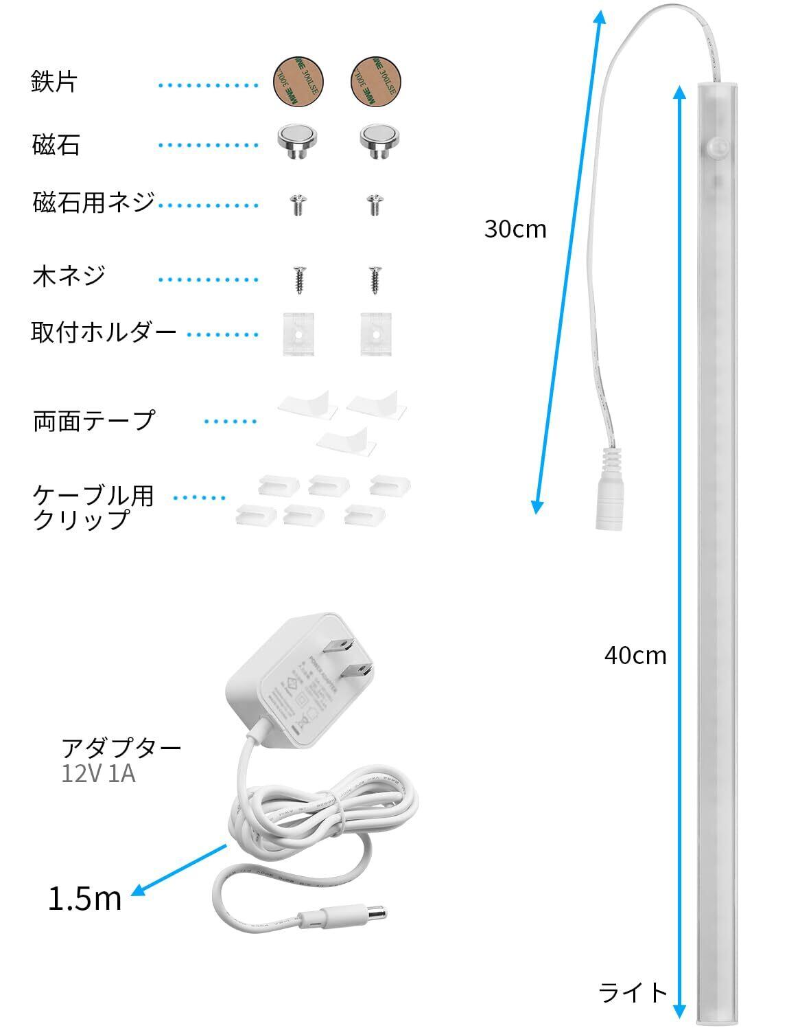【パッケージ】1×センサーライト 40cm;1×ACアダプター;2×両面テープ;2×マグネット;2×ネジ;2×取り付けクリップ;4×ケーブルクリップ;1 X 説明書。