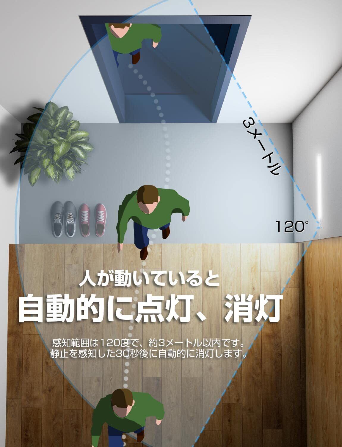 【自動点灯・自動消灯】人感センサー搭載して、120度以内で3メートル以内の動体検知してライトが点灯し、約30秒後に動体が検知されない場合は自動に消灯します。