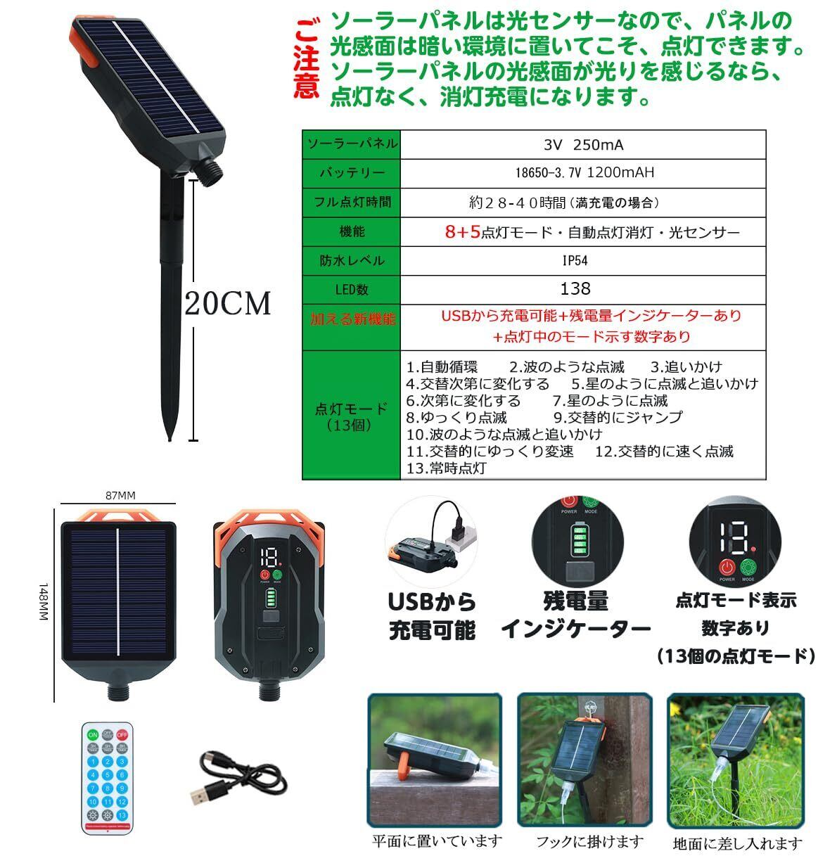 【ソーラー充電の注意点】充電の時、ソーラーパネルの光センサー面は日光直射する所に置いてください、木の下とか、日光の反射の所とかに置いてなら、充電効率は大幅下がります。最後に、ご住んでいる所の緯度が高くて、日照時間が短いなら、点灯時間も短くなります。予めご了承ください。