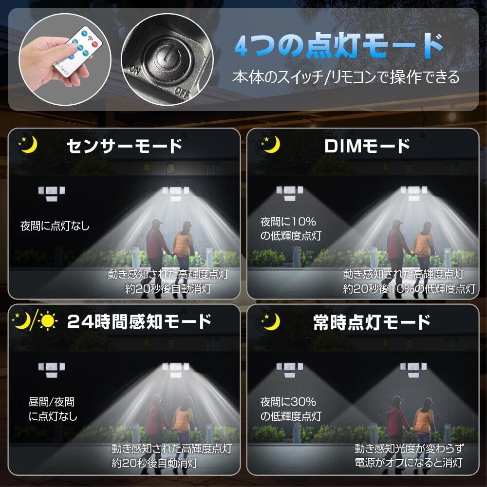 【4つ点灯モード】センサーモード、DIMモード、24時間感知モード、常時点灯の4つ点灯モードが搭載させたセンサーライトです。本体のスイッチでモードを切り替えるだけでなく、リモコンでも簡単に操作できます。リモコンの感知距離は15メートルになります。「センサーモード」夜間に3~5メートルの距離で人の動きを感知すると、自動的に強い光が点灯し、人が離れると15~20秒後に自動的に消灯します。「DIMモード」夜間に3~5メートルの距離で人の動きを感知すると、自動的に強い光が点灯し、人が離れると15~20秒後自動的に弱い光を変わります。「24時間感知モード」昼夜問わず3~5メートルの距離で人の動きを感知すると、自動的に強い光が点灯し、人が離れると15~20秒後に自動的に消灯します。「常時点灯モード」夜間に弱い光で常時点灯モードが自動的にオンになり、動きが感知しても光度は変わらず、デバイスの電源がオフになるとライトが消灯。