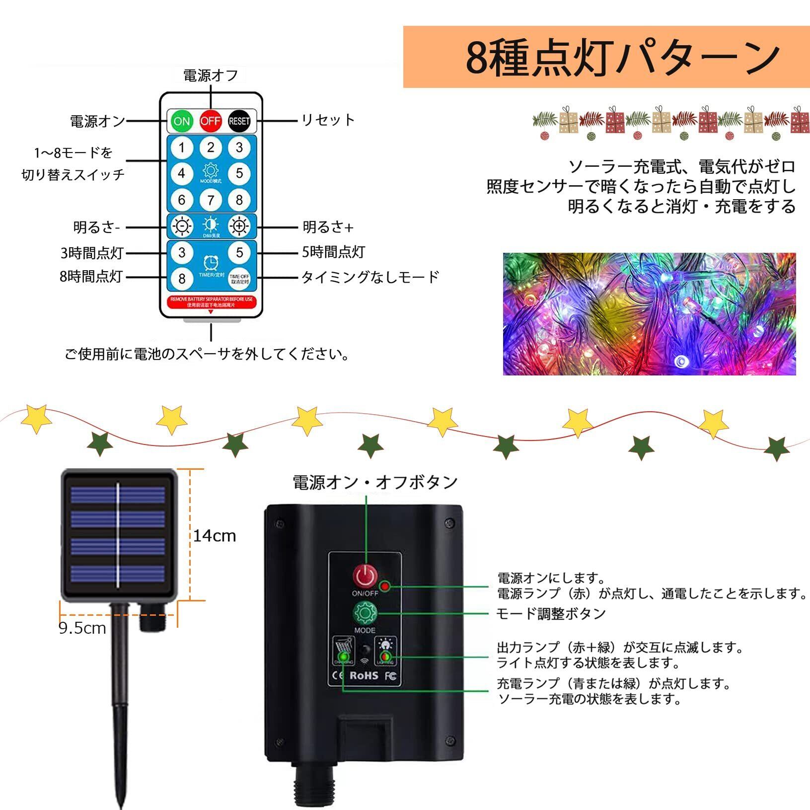 【商品サイズ】長さ:9本*3.5m、電源コードの長さ約5m、重さ:約0.8kg。防水:IP65。高輝度350LED球を採用、想像以上の明るさが見えます。リモコン付属、点灯輝度、タイマー設置できます。全8種類の点灯モードがあります。リモコンで、点灯モードを設定できます。連続変更、波状変更、点滅変更、ちらつき変更、急速変更、低速変更、ドリーム変更、固定点灯という8種類の光るパターンがあるイルミネーションライトです。▶ソーラーライト カラー:赤、青、緑、黄4色ミックス。ひとつひとつのLEDがカラフルに優しく光り輝いて幻想的でロマンチックな空間を演出します。クリスマスやパーテイーの飾り付けに、お部屋や窓辺の間接照明・インテリアとして、テラスやお庭のアクセントやライトアップにぜひ!バレンタインデーやクリスマス、新年、誕生日、家族パーティー、ツリー 飾り付け 庭 ガーデン 芝生 植え込みに飾りつけのイメージに合わせ不雰囲気が作ります。