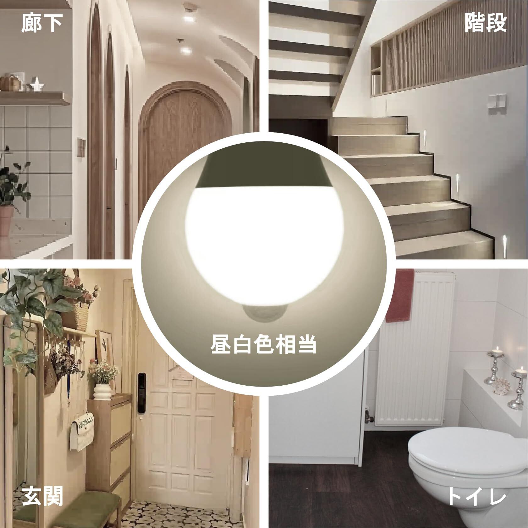 【自動点灯・自動消灯】人感センサー搭載のLED電球。人の動きを検知して自動で点灯します。人の動きがなくなると約60秒後に自動消灯します。消し忘れの手間や夜間の点灯の不便を解消。ご注意:人・動物などが動きを検知し続けると、ライトが点灯し続ける。途中で暗くなってしまう心配がない。