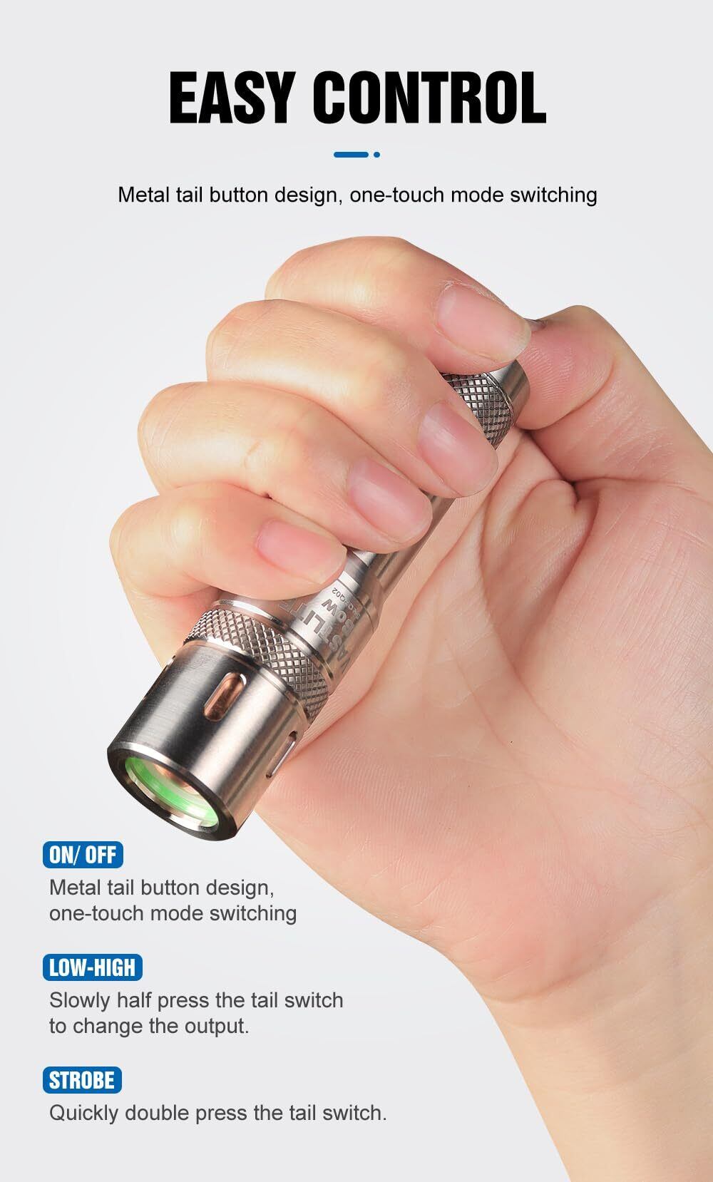 その強力な機能にもかかわらず、Vastlite Bowは非常にコンパクトで軽量です。長さはわずか90.5mm、チューブの直径は23.5mmです。 重さはわずか122グラムで、この懐中電灯はポケット、バックパック、ギアポーチに入れて持ち運びやすく、毎日の持ち運び(EDC)やアウトドア遠足に最適です。 コンパクトなデザインは耐久性を損なうことはありません。高品質のアルミニウム製で、屋外での使用にも耐えられる頑丈な作りです。