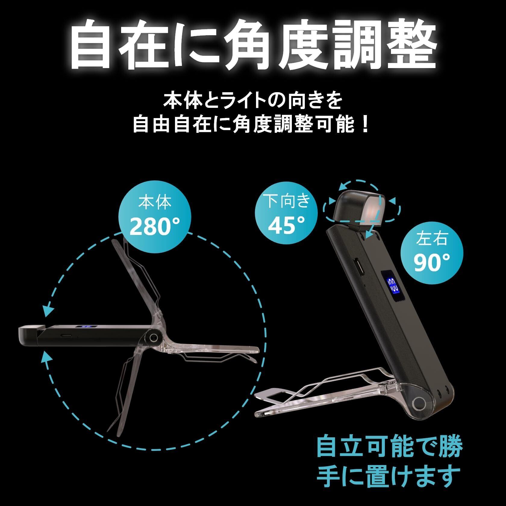 【照明角度自由調整】クリップ式デザインで、滑りにくく、本に簡単に取り付け可能。クリップは最大280°まで開き、ライトヘッドは水平方向に左右90°、下向き45°に回転できます。角度を自由に調整できるため、手元の明かりを自在にコントロールでき、読書中の目の負担を軽減します。