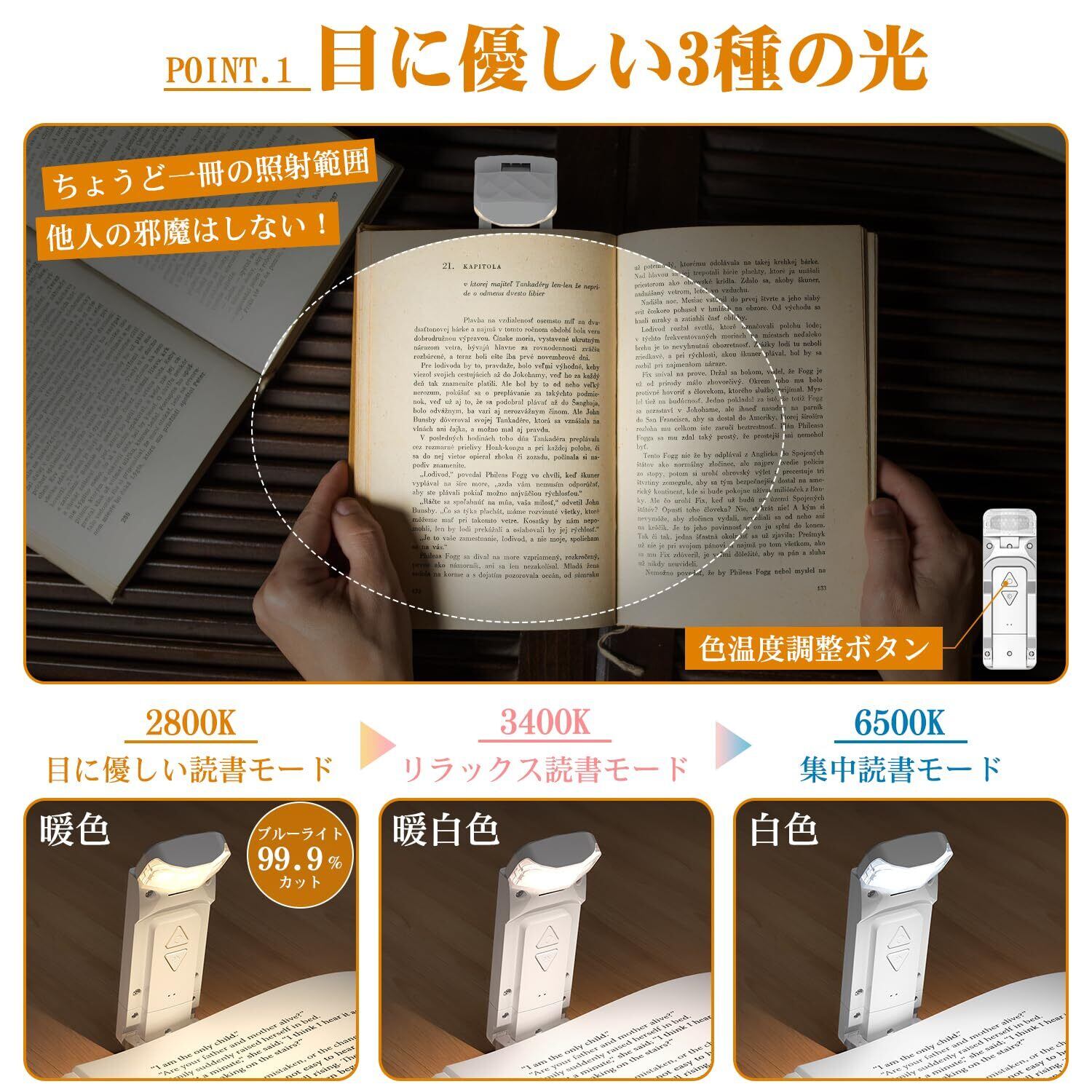 この読書灯は、明るさを5段階で調整でき、色温度(暖色・自然光・白色)も選べるため、どんなシーンでも最適な光を提供します。お気に入りの本を楽しむための理想的な環境を実現し、目の負担を軽減します。