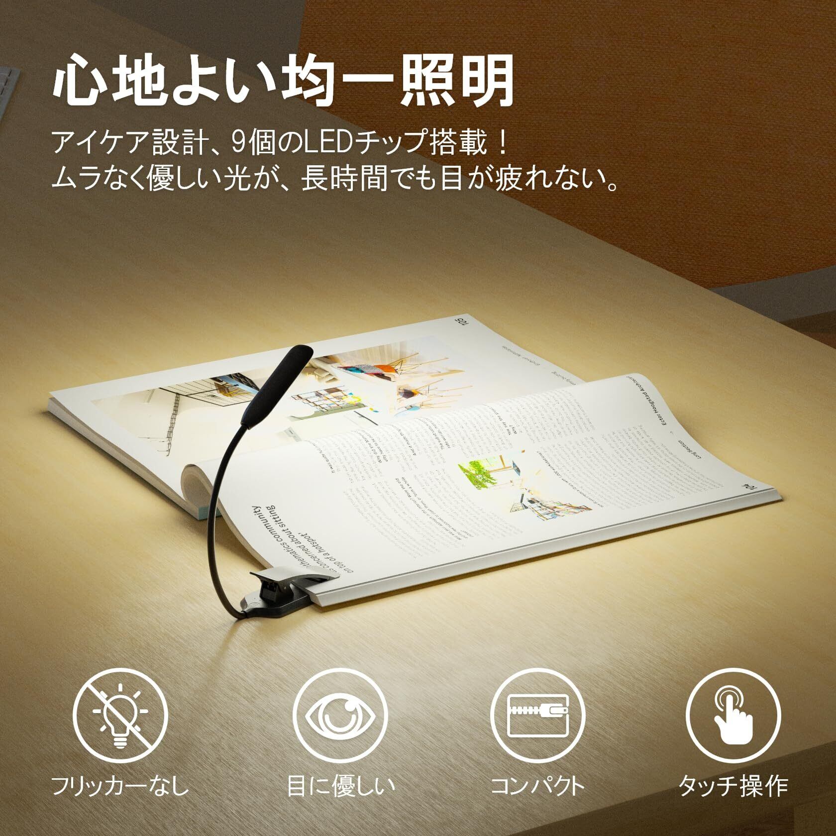 【目に優しい&均一な光】9個の高品質LED発光チップを採用し、明るく均一な光を実現。チラツキのない光で目を守り、長時間の使用でも疲れにくい、快適な読書体験を提供します。パートナーに気を使わない、夜のベッドタイム読書に最適です。
