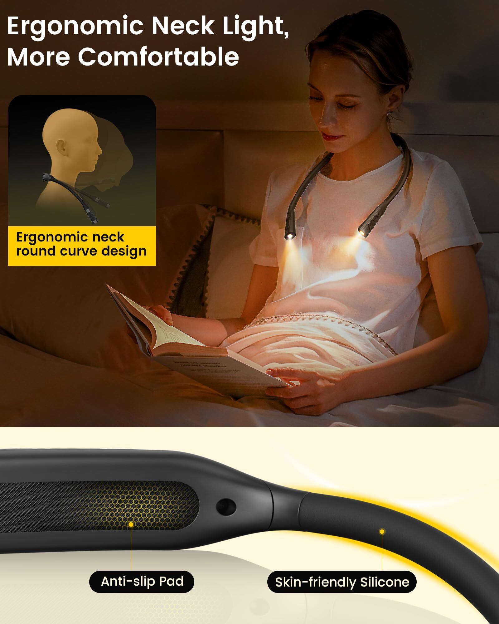 【人間工学に基づいた快適設計】首にぴったりフィットするスリムなネックカーブ(厚み:2.5cm → 1.7cm)で、軽量わずか124g(4.37oz)とほとんど重さを感じません。高品質なABS素材と肌に優しいシリコンを使用し、髪を絡めず滑らかな触り心地。柔らかい滑り止めパッドでしっかり固定されるため、読書・編み物・キャンプ・クラフトなどあらゆるシーンで快適に使用できます。