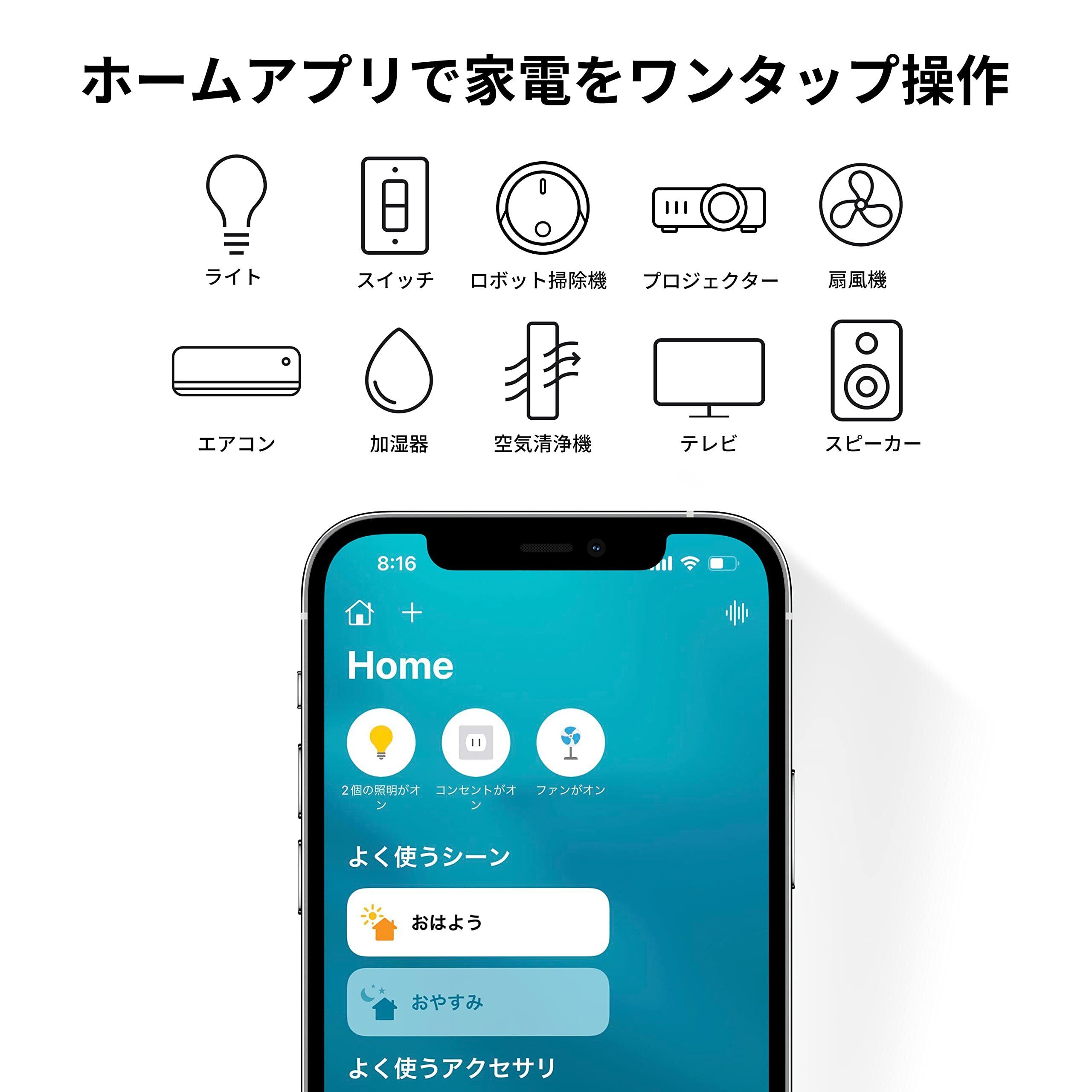 【Apple 製品対応】Appleユーザーの方は、ホームアプリから家電を操作し、スマートホームを気軽に体験いただけます。他のアプリをダウンロードする必要はなく、Apple製品の「ホーム」アプリと連携するだけで、いつでもどこでもご自宅の家電や照明のON/OFFを管理できます。